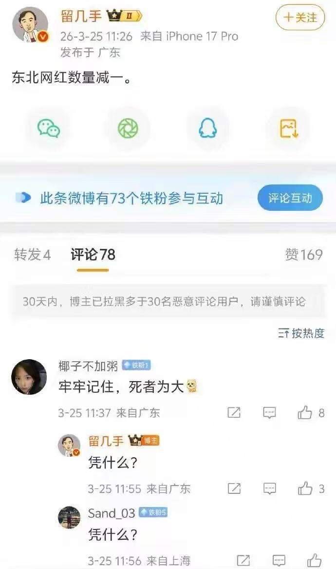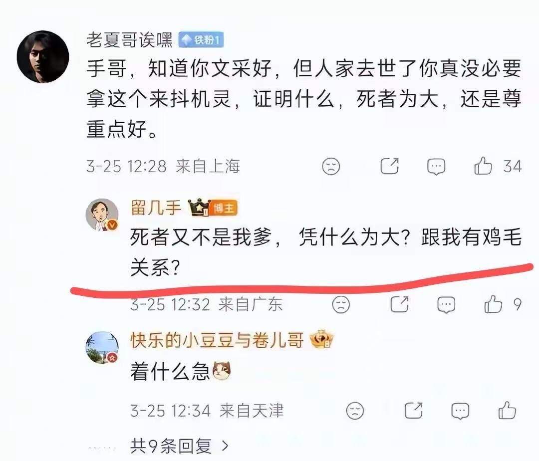 网红留几手发文暗讽张雪峰去世,惹众怒!当有好心网友在评论区提醒他“死者为大,积点口德”时,留几手不仅没收敛,反而像被踩了尾巴一样,直接回怼了一句惊世骇俗的话:“死者又不是我爹,凭什么为大?” 当“毒舌”越界成“毒心”:一句“不是我爹”照出了多少流量乞丐的丑陋 “死者又不是我爹,凭什么为大?” 当网红留几手在评论区打下这行字时,他可能以为自己很“酷”,很“敢说”,很“与众不同”。但这句话像一面照妖镜,瞬间照出了流量至下某些人灵魂的贫瘠——为了博眼球,可以丢掉做人最基本的底线。 这不是特立独行,这是人性缺失;这不是犀利点评,这是对生命最基本的漠视。 一、当“毒舌”人设,变成“毒心”表演 互联网曾有一段时间,追捧“毒舌”“犀利”“敢说真话”的人设。但不知从何时起,这条赛道开始变质——有些人把刻薄当深刻,把无礼当个性,把践踏底线当流量密码。 留几手们的逻辑很简单:在信息爆炸的时代,温和理性吸引不了眼球,只有极端言论才能引发争议,争议带来转发,转发带来收益。于是他们精心计算,哪句话能刺痛大众神经,哪个话题能挑起对立情绪。他们贩卖的不是观点,而是情绪鸦片;消费的不是事件,而是人性中最原始的愤怒与焦虑。 张雪峰老师生前帮助无数学子规划人生,他的突然离世让许多人痛心。而留几手们看到的不是一条生命的逝去,而是一个“热点”,一个可以蹭流量、立人设、展示自己“与众不同”的机会。这种将他人悲剧转化为自我营销素材的行为,已不是言论自由的问题,而是人性底线的溃败。 二、“死者为大”背后,是人类文明的共同底线 “死者为大”不是封建迷信,而是人类文明积淀千年的朴素共识。它代表着对生命的敬畏,对逝者的尊重,对悲伤者的共情。这是一个社会最基本的温情底色。 当一个人可以对逝者毫无顾忌地嘲讽,对生者的悲痛漠然无视时,他失去的不仅是口德,更是与他人共情的能力。一个对生命缺乏敬畏的人,其言论再“犀利”,也不过是灵魂空洞的回响。 那些在评论区为这种言论叫好,认为“真性情”“打破虚伪”的人,或许没有意识到:当我们为践踏底线者鼓掌时,我们也在亲手拆除自己周围的文明护栏。 今天他可以冷漠对待别人的至亲,明天就可能以同样的态度对待你珍惜的一切。 三、流量狂欢下,我们正在失去什么? 这场闹剧最可悲之处在于:留几手获得了想要的流量,平台收获了活跃度,围观者宣泄了情绪——所有人都参与了这场盛宴,唯独逝者的尊严和生者的悲痛,被遗忘在角落。 算法不会识别善恶,只会推送最能引发互动的内容。于是,越是极端、越是反常识、越是挑战底线的言论,越容易被推到我们面前。我们在这样的信息茧房中待久了,会逐渐麻木,误以为这就是世界的全部样貌。 但请记住:流量会过去,热搜会冷却,但人性中那些温暖的、尊重的、共情的部分,才是支撑我们社会不至崩塌的基石。 四、每一次沉默的纵容,都是对恶的默许 面对这样的言论,如果我们只是划过、叹息,甚至带着猎奇心态围观,那么我们都在无形中成为这种畸形流量的共谋。 这个时代不缺声音,缺的是负责任的声音;不缺流量,缺的是有温度的流量。我们可以选择用关注和点赞,去支持那些认真创作、尊重生命、传递善意的内容创作者。我们的每一次点击,都是在为我们想要的世界投票。 张雪峰老师生前常说:“选择比努力更重要。” 今天,我们也面临一个选择:是纵容这种以践踏底线为代价的流量游戏继续上演,还是用我们的态度告诉这个世界——有些线,不能越;有些话,不能说;有些尊重,必须给。 因为终有一天,我们都会成为“死者”。而我们今天对待逝者的态度,决定了未来别人将如何对待我们,以及我们所爱之人。 一个健康的社会,不应该让践踏尊严者成为焦点,而应该让那些在平凡中坚守善意、在喧嚣中保持尊重的人,被看见、被铭记。 这才是流量应该奔赴的方向,也是我们每个人内心最深处的渴望。对张雪峰 张雪峰停播 张雪峰账号异常 张雪峰猝死 张雪峰怒怼评委 张雪峰直播争议 张雪峰热词