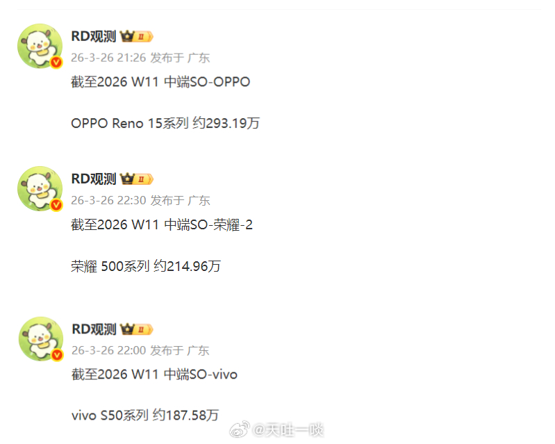 PS:对比了一下W10周的销量,OPPO Reno15系列环比是下跌的,vivo S50系列环比微增,荣耀500系列环比是微降。