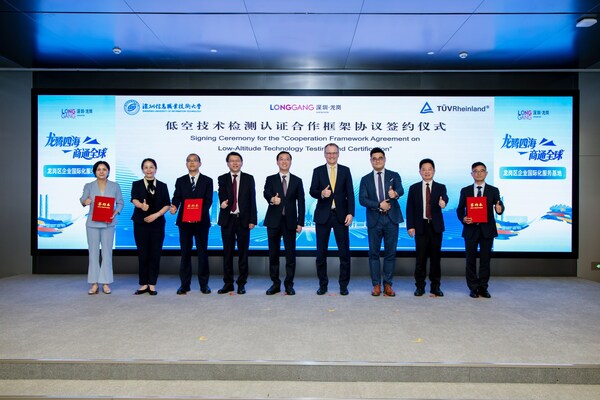 深圳2026年3月27日--3月25日,国际独立第三方检测、检验和认证机构德国莱茵TÜV大中华区(简称"TÜV莱茵")与深圳市龙岗区商务局、深圳信息职业技术大学在龙岗区企业国际化服务基地正式签订《低空技术检测认证合作框架协议》。深圳市龙岗区委书记余锡权,深圳信息职业技术大学党委书记苗宁礼博士,TÜV莱茵集团首席执行官、管理执行董事会主席富笔博士(Dr.MichaelFübi)、大中华区产品服务事业群高级副总裁杨佳劼等三方代表共同出席签约仪式。