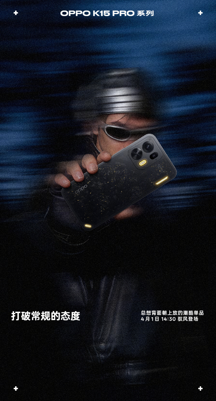 OPPO的K15 Pro系列这次做得是更好看了,很酷很帅的设计,还有粉色。后改上面配了两个灯,然后扬声器好像也是有说法的?海报也都做得很酷新机来了