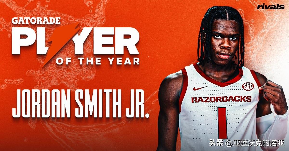 阿肯色后卫Jordan Smith Jr荣获佳得乐高中年度全美最佳球员,他儿时的偶像约翰-沃尔John Wall亲自现身,为他送上了这份惊喜大奖,他是自1992年Corliss Williamson以来,首位获此殊荣的野猪球员,ESPN球探盛赞史密斯,防守全美第一,即插即用,其赢球心态将深受球迷喜爱。