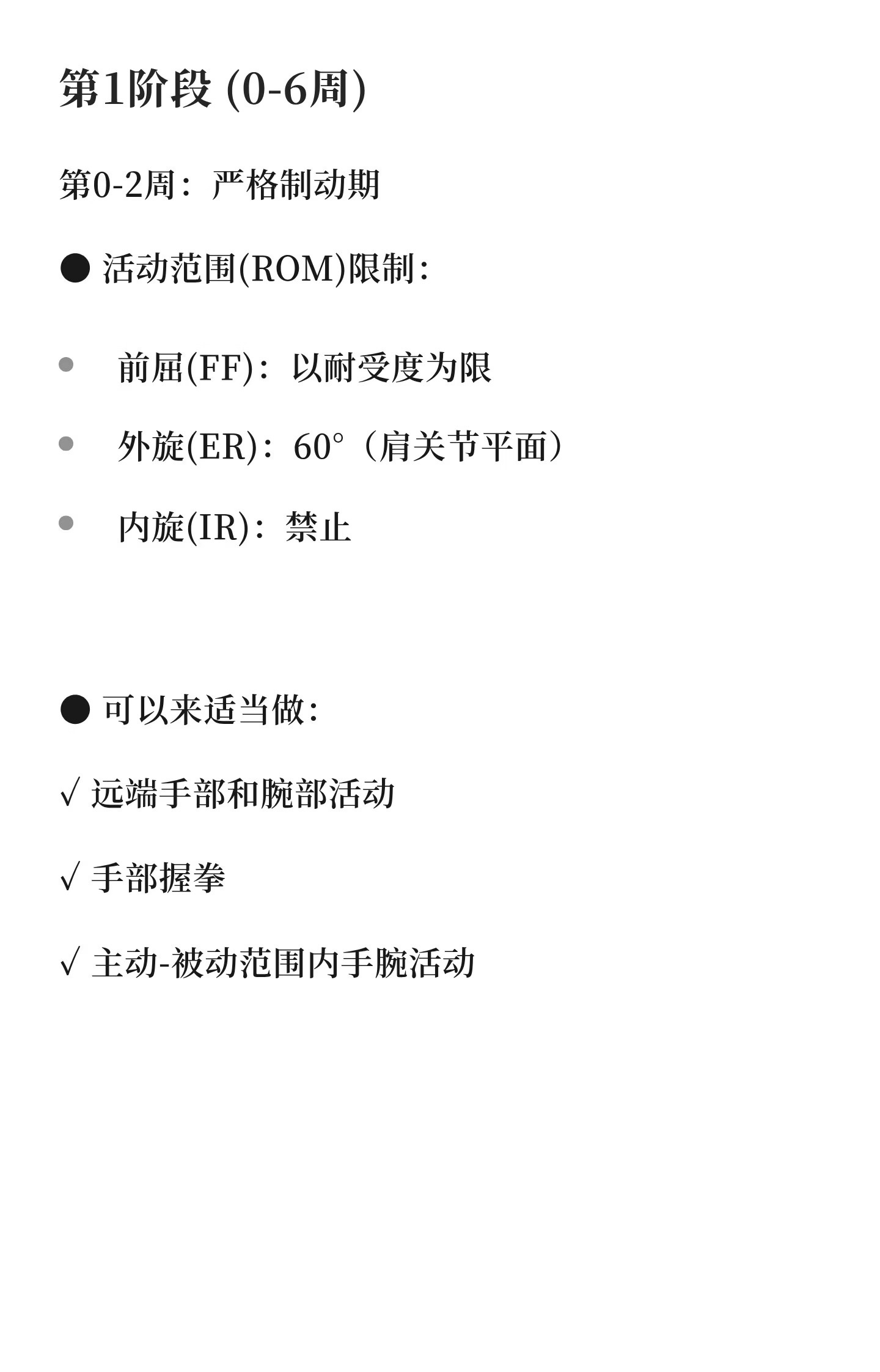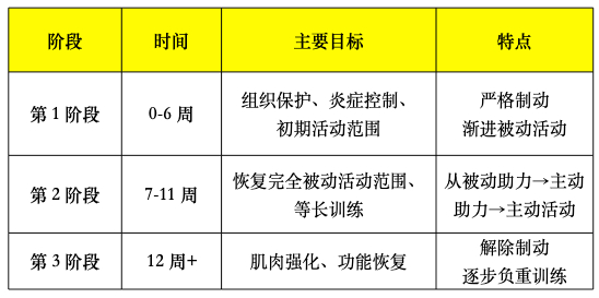 【第1阶段 0-6周】组织保护、炎症控制、初期活动范围——严格制动渐进被动活动