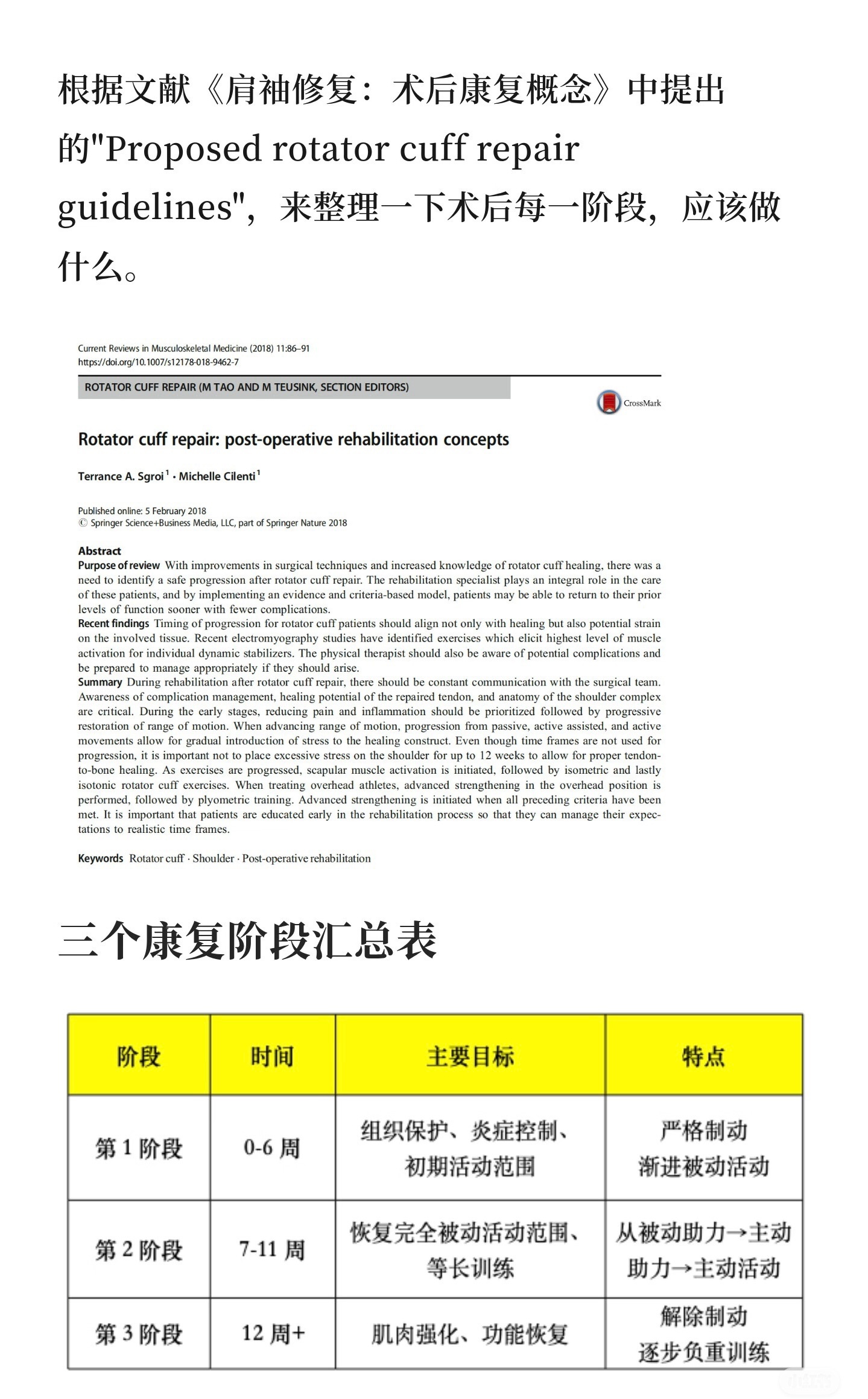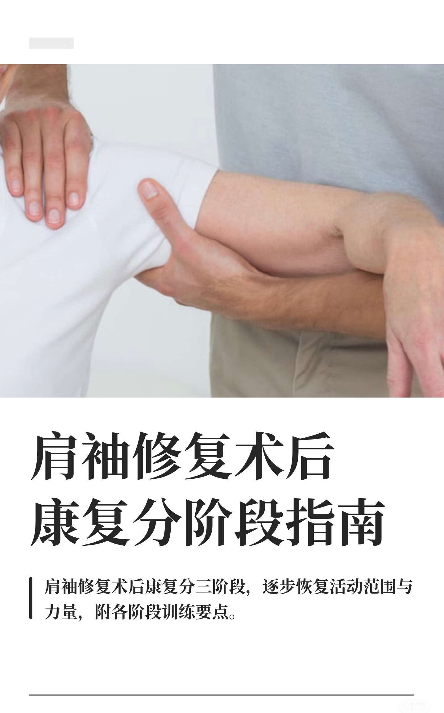 肩关节损伤 最近和大家讲肩袖损伤,那么除了保守康复,如果做了修复手术,该怎么进行术后康复呢?今天来和大家分阶段聊一聊——