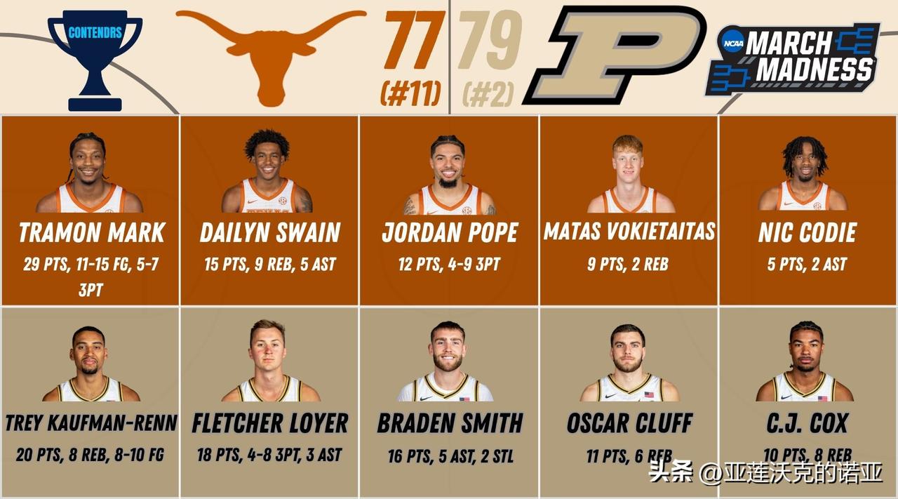 西区2号种子普度击败11号种子德州大学晋级精英八强,Trey Kaufman-Renn完成致胜补篮,全场得到20分8篮板,他成为普度队史上首位在疯狂三月 于最后1秒投中绝杀球的球员,Rick Mount之前曾在1969年的精英八强投中过制胜球,但当时还留有两秒的时间。