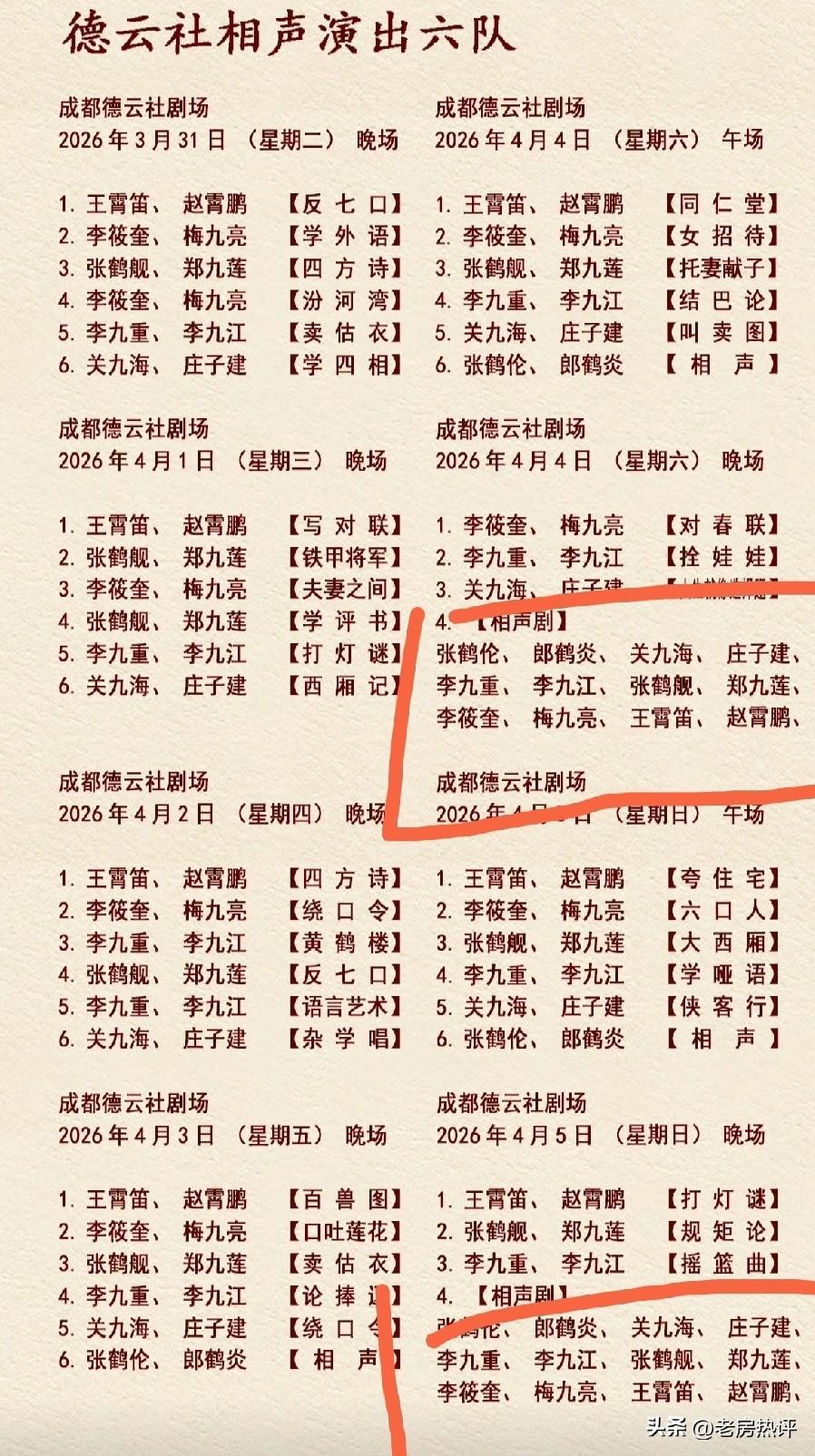 喜欢张鹤伦,特别是喜欢六队相声剧的观众有福气了! 这周和下周张鹤伦将带着他的六队来成都德云社演出! 果然新剧场福利大,看到底角的机会多。要知道张鹤伦一年在小剧场也演不了几场。 这次观众不仅能看到张鹤伦,还有很多粉丝期盼好几年的六队相声剧也要来了: 下周4号和5号,张鹤伦将带着六队全体演员演两个相声剧! 有张鹤伦带队演的相声剧《上课了》系列,还有他为郎鹤炎庆生创作的《四十不惑》,都演出时常受观众欢迎,给观众留下很深的印象。 当年演这些相声剧时,张九南还没有调到八队,关九海张霄白还是好搭档,这几位特别是张九南在相声剧中都有精彩的表演。 现在张九南都已经荣升十队队长,海白已经裂穴,各自有了新搭档。 小白出品,必是精品,六队的新相声剧虽然缺少了狗子张九南这个灵魂人物,相信六队的新相声剧演出时,现场一如既往地炸场。