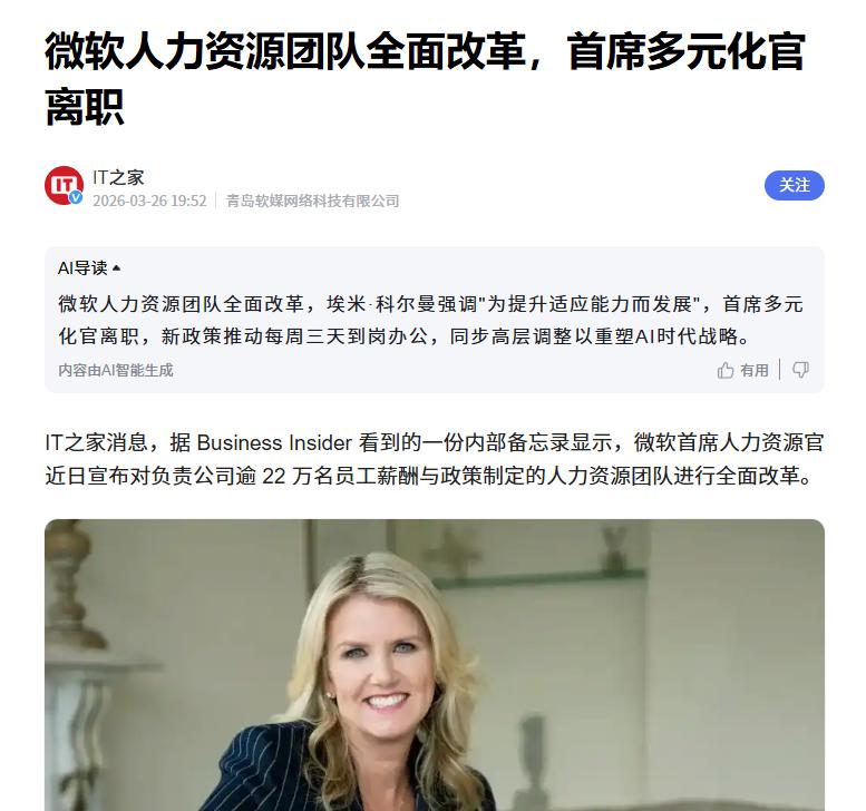 据了解,近日一份内部备忘录指出,微软正在对人力资源团队展开全面优化。 已知除微软首席人力资源官埃米 · 科尔曼在邮件中表示::“当下,技术、工作方式以及我们的组织架构都在不断变革。变革的速度已超出我们现有运营模式和决策节奏的适配范围。如今我们不再需要为追求稳定而扩张,而是要为提升适应能力而发展,并助力确立新的发展节奏。” 微软的首席多元化官林赛-雷 · 麦金太尔也将于 3 月 31 日离职。