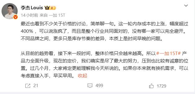 一加李杰谈手机内存成本上涨 一加中国区总裁李杰在个人主页上表示,从目前的趋势看,不仅行业内没有品牌能避开内存涨价的影响,而且在未来大家的产品价格也只会越来越高。以至于对目前的消费者而言,早买早享受反而成了一种更有性价比的选择。 “这一轮内存成本的上涨,幅度超过 400% ,可以说涨疯了,而且是整个行业共同面对的,没有哪一家可以完全避开。”