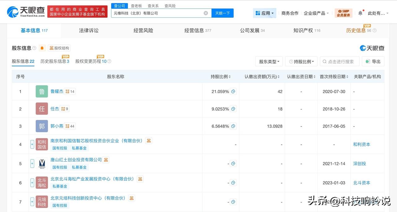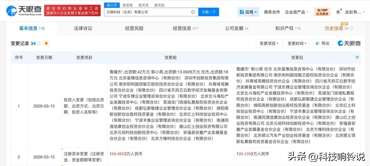 【北京顺义汽车产业基金等入股元橡科技 后者为立体视觉解决方案提供商】 天眼查App显示,近日,元橡科技(北京)有限公司发生工商变更,新增北京顺义汽车产业创业投资基金(有限合伙)、北京顺义领新私募股权投资基金合伙企业(有限合伙)为股东,同时,注册资本由约189万人民币增至约199万人民币。 元橡科技(北京)有限公司成立于2017年3月,法定代表人为鲁耀杰,经营范围含专业设计服务、数据处理和存储支持服务、数据处理服务、智能车载设备制造、智能车载设备销售、物联网技术研发等。股东信息显示,该公司现由鲁耀杰、唐山红土创业投资有限公司、北京北斗海松产业发展投资中心(有限合伙)及上述新增股东等共同持股。 公开信息显示,元橡科技专注于智能立体视觉领域,提供双目立体视觉芯片、摄像头模组等软硬件一体解决方案, 天眼查信息: