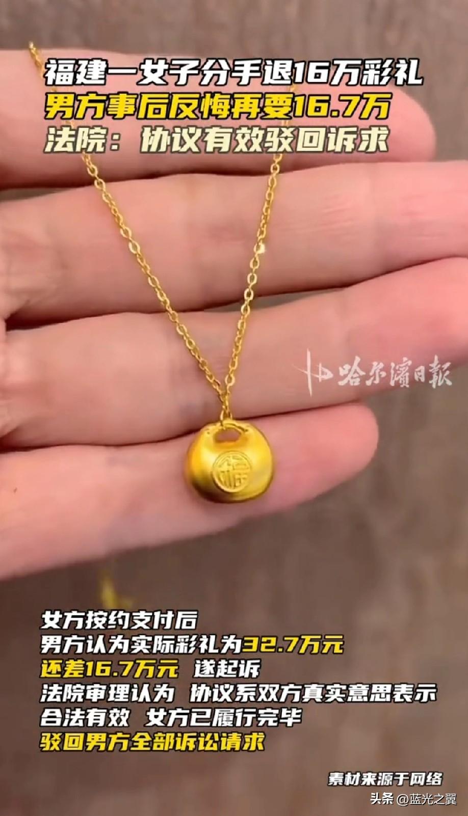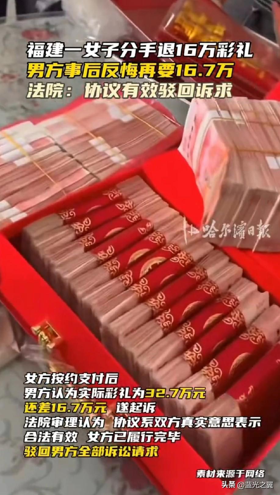 “这钱也太好赚了——两个月就赚了16万!”福建,一对男女订婚同居两月后,产生了矛盾便选择了分手。女方退还了16万的彩礼,男方觉得自己实际支付的彩礼有32.7万元,这16万元太少了,遂直接将女方告上了法庭,要求女方再返还16.7万元! 2023年,陈城(化名)与林音(化名)经人介绍相识后订婚。男方陈城支付了35.5万元彩礼,女方当日回礼2.8万元及一条金项链。订婚后,两人共同生活约两个月,便因矛盾分手! 分手后,双方父母于同年6月签订了一份《解决书》,约定女方退还彩礼16万元,并明确“此事结清,今后互不追究”。协议签订当天,女方转账支付了16万元! 事情到此本该画上句号。但事后,男方却认为这笔账应该重新算:扣除回礼2.8万元,实际彩礼应为32.7万元,女方仅退还16万,还差16.7万元。于是,他将女方一家告上法庭! 法院审理认为,双方签订的《解决书》系真实意思表示,内容不违反法律强制性规定,合法有效。女方已按协议履行完毕,男方再行主张返还剩余彩礼,缺乏依据。最终判决驳回男方全部诉讼请求! 有网友说,这起案件中,女方通过一纸协议锁定了16万元收益,男方则因缺乏法律常识而“主动放弃”了部分合法权益。从经济角度看,扣除回礼后实际彩礼为32.7万元,女方保留了近一半,确实显得“回报率”不低! 但需要明确的是,法律并未认定这种行为构成骗婚。骗婚通常指以非法占有为目的,虚构事实隐瞒真相骗取财物,而本案中的协议是双方自愿达成的! 对男方而言,这是一个关于契约精神的教训。在签订协议前,他没有详细审查条款,没有要求提供详细的清单或保障条款,就草率签字。事后反悔不仅违背诚信原则,也注定得不到法律支持! 对公众而言,这一案件提醒我们:在涉及重大财产利益的纠纷中,任何书面协议都应当慎重对待。一旦签字画押,就意味着对协议内容的认可和接受。 如果协议存在“显失公平”的情形,受损方虽可在一年内请求撤销,但“显失公平”的认定标准极高,需证明当时处于危困状态、缺乏判断能力等,这往往是难以证明的! 彩礼本是承载美好期许的传统礼节,不应沦为金钱计算的工具。从更深层次看,这一案件的背后,暴露的是当下婚恋市场中金钱与情感的畸形关系。当两个月的共同生活被折算成16万元,当婚姻的缔结被简化为利益的算计,感情的成分还剩多少? 或许,比法律裁决更值得思考的,是让彩礼真正回归“礼”的本质——它不是婚姻的价码,而是情感的见证。在谈婚论嫁时,双方都应当重情轻财、理性沟通,让婚姻回归情感的本质。否则,类似的闹剧只会不断重演,而每个人都可能成为下一个算计者或被算计者!