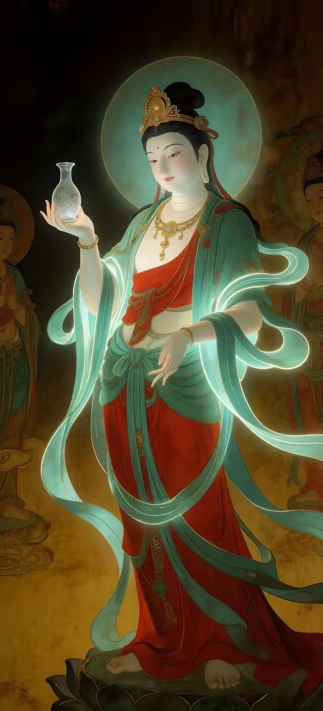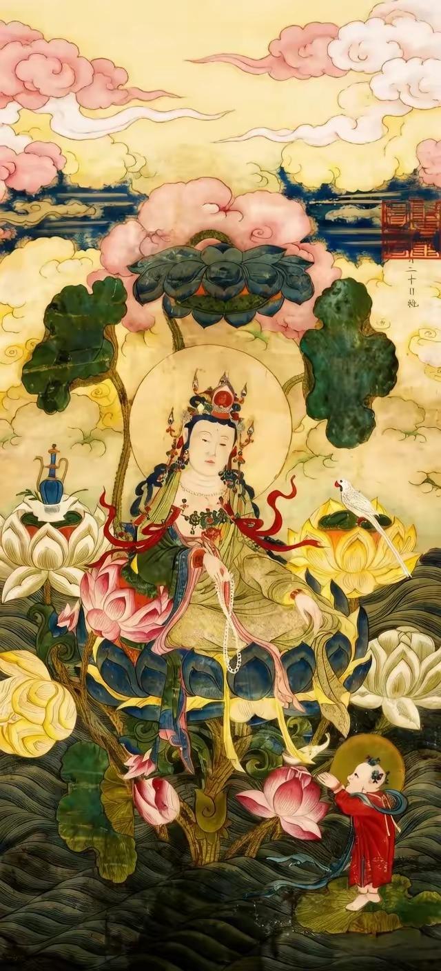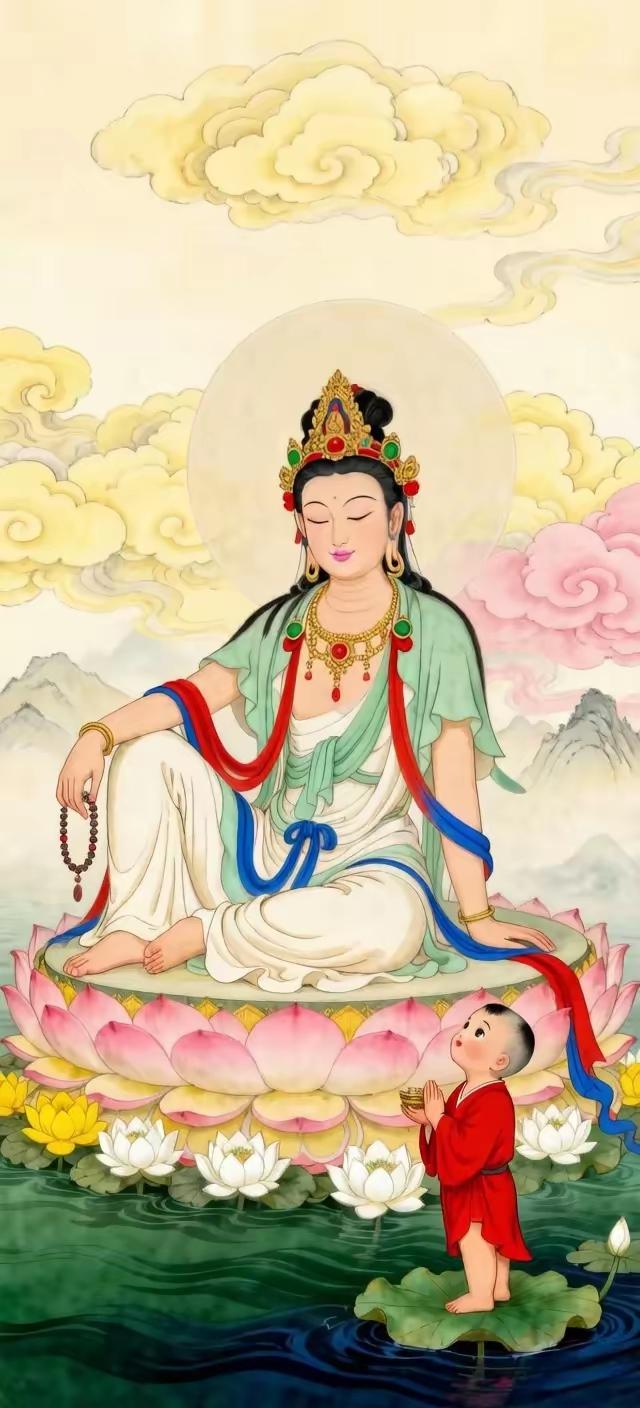 手机壁纸~莲台座上,宝相庄严,祥云缭绕间尽是慈悲与安宁,每一笔都绘着东方信仰里的温柔力量,传递着渡人渡己的禅意与温柔