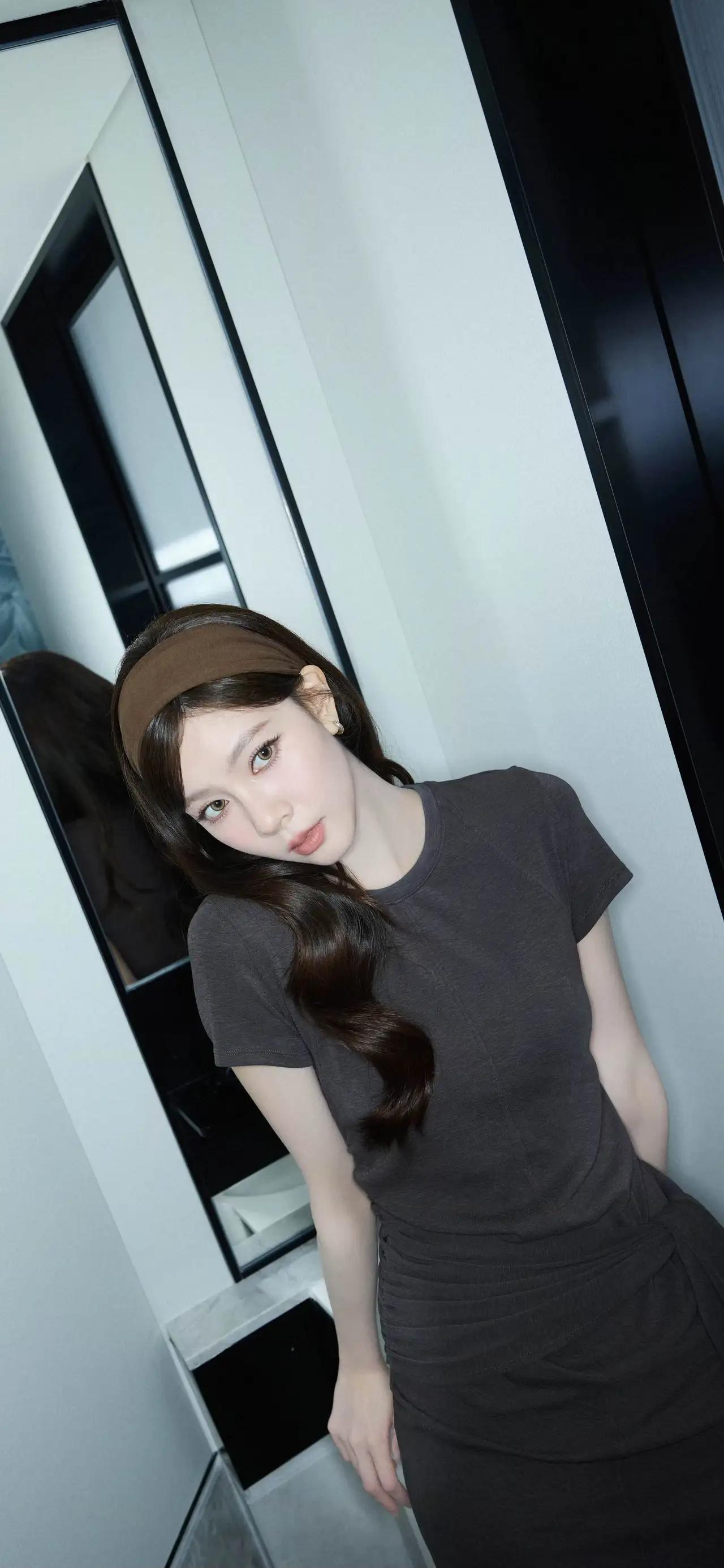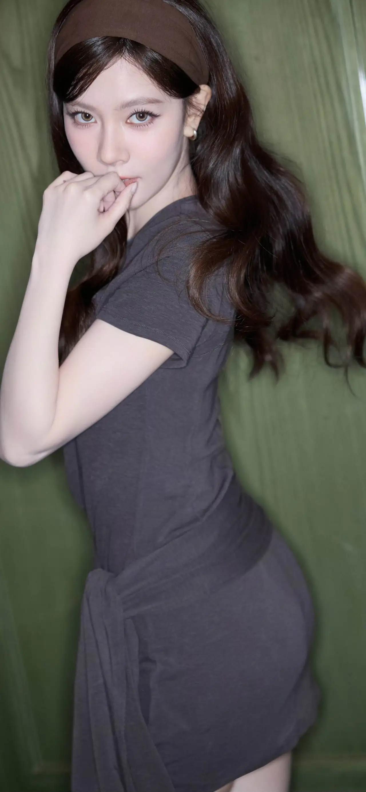 美女壁纸~宋妍霏,深灰针织裙裹着松弛感,同色系发带衬得卷发温柔又慵懒。每一个角度