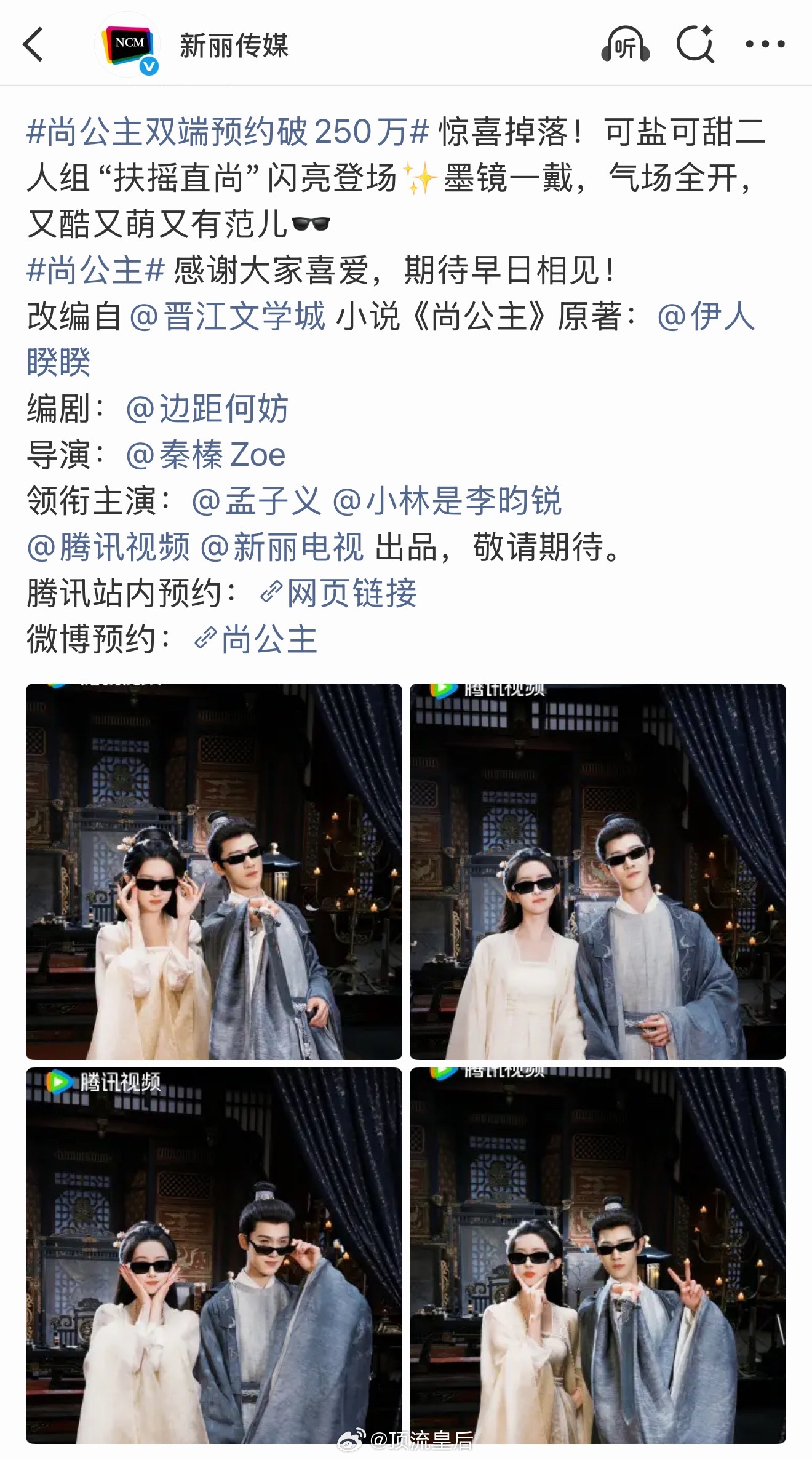 恭喜孟子义、李昀锐主演的尚公主双端预约破250万,墨镜一戴,闪亮登场。