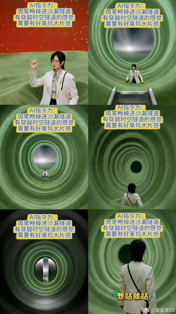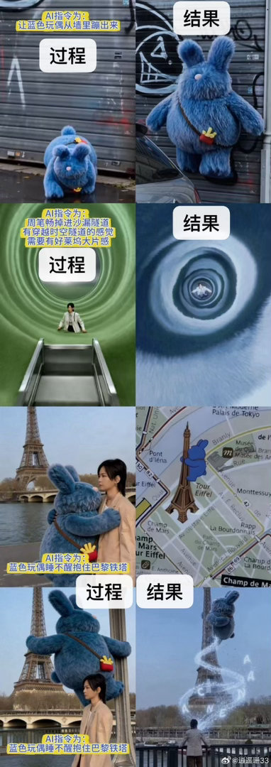 周笔畅被AI气笑的瞬间 周笔畅工作室发的幕后花絮,承包了我一整天的笑点。AI生成的过程和提示文字完全是两个世界——让睡不醒从涂鸦墙上化开,结果它真的像奶油一样在墙上“爬行”;让笔笔接电话,她突然蹲下接了个龙虾形的话筒。最终MV有多高级,调试过程就有多离谱。
