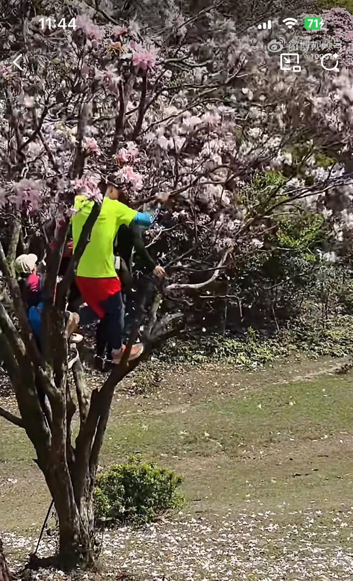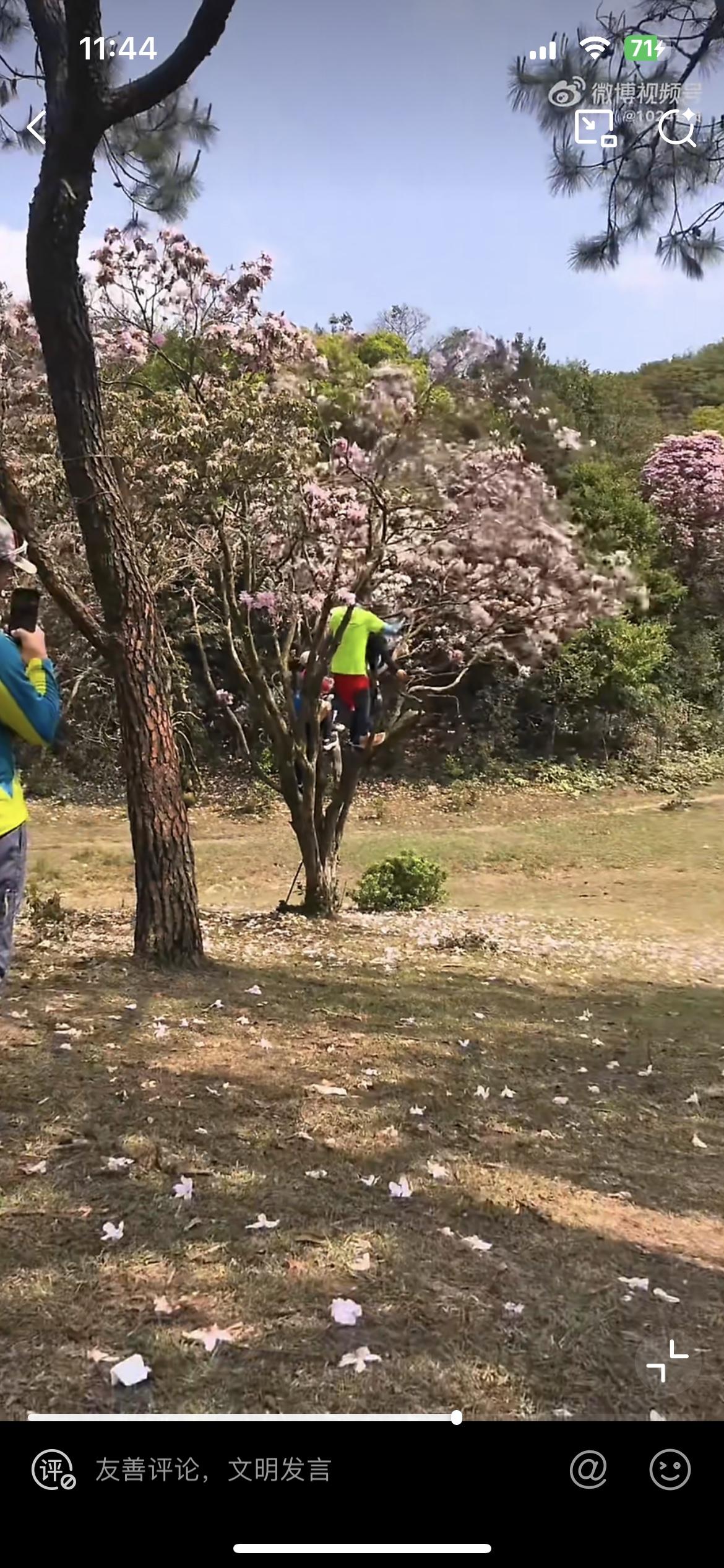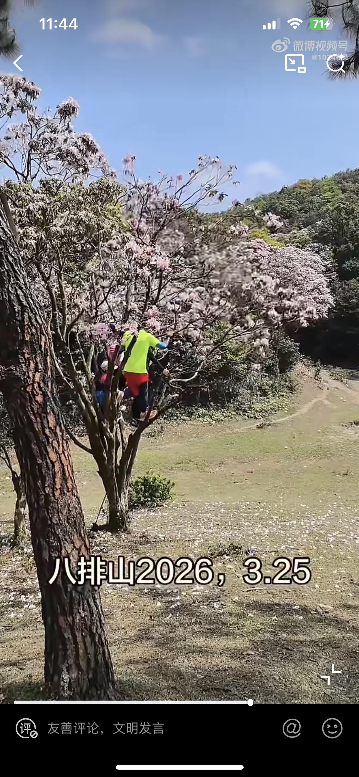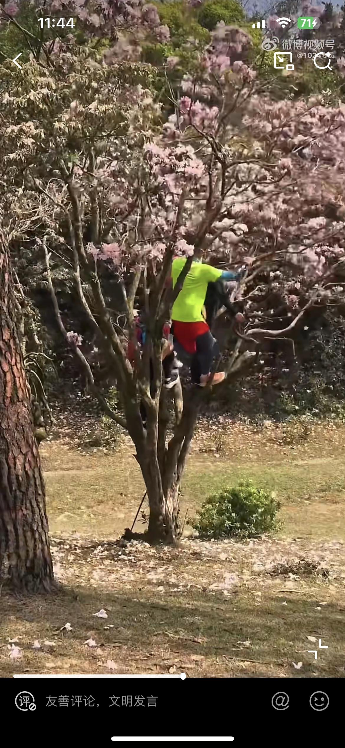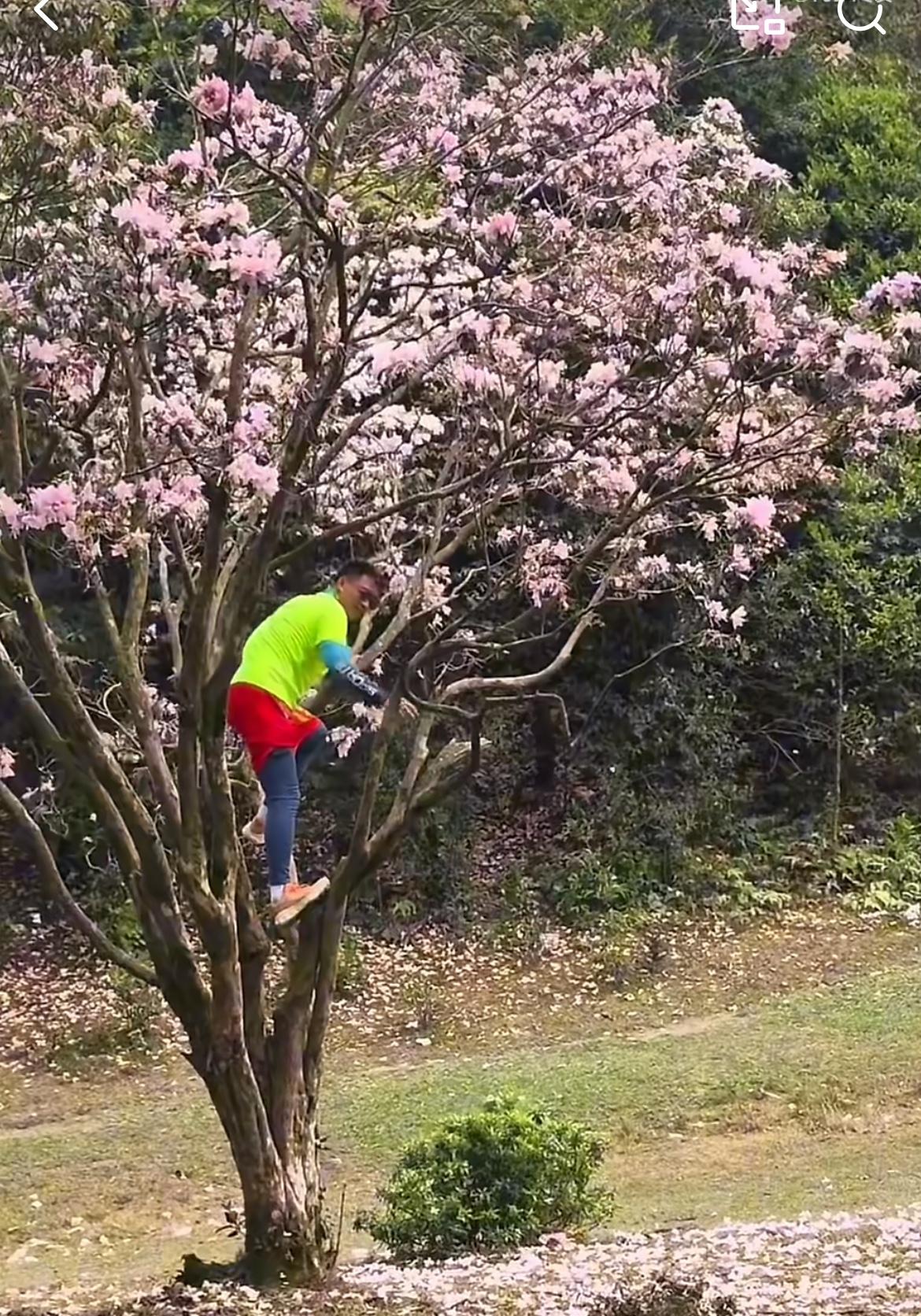 云浮八排山春光明媚,一群没素质的男女,摇晃杜鹃花树形成花雨,让旁边的人拍照,一路过的游客看不惯,出言阻止,叫他们不要摇树。穿绿衣服的男子回头看,死死地盯住阻止他的女子,心里在说不要多管闲事。事后这名女子遭到他们的威胁。一树开得正艳的杜鹃花,在树下围观拍照,感受无限的春光,不就挺惬意吗?非要爬上树人为搞破坏,就为了满足自己拍照好看,自私自利。这群人要是树枝断摔下来,铁定会找景区的麻烦,说他们未尽安全保障义务。