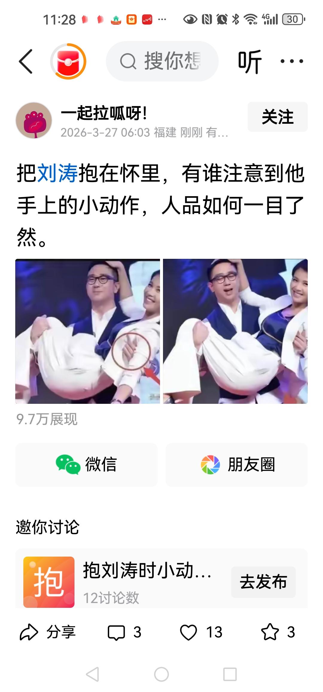 他有手上什么小动作了吗?一个让抱一个更愿意抱有什么毛病吗?只是广庭大众下这样抱好吗?男不婚女不嫁吗?你一是男人,你抱着她一女人,想干嘛?她又不是你老婆,要不要配乐大花轿,抱一抱抱一抱,抱着妹妹上花轿?上花轿干嘛?上完花轿又干嘛?这个谁不懂?男欢女爱的,你情我愿,你操心什么?你说三道四什么?又关你什么事?无非你想抱而不得抱?呵呵,其实俺也想抱,去抱一个不是自己老婆的女人,咱男人那点龌龊的想法能不知道,哈哈哈。