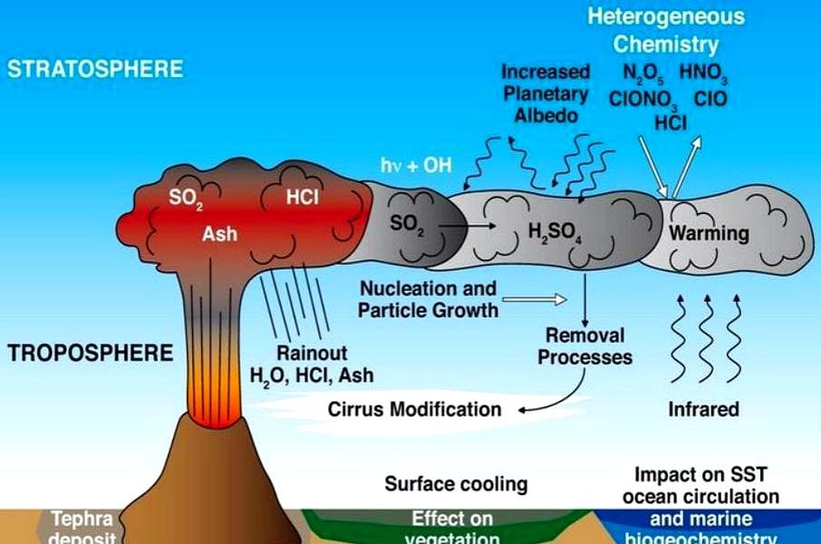 想象一下,火山灰和含硫气体冲到天上,形成硫酸盐气溶胶满天飞,搞不好全球温度都得降,来个“火山冬天”,像历史上那次托巴火山喷发一样,降温十几年,人类差点儿挺不过来。