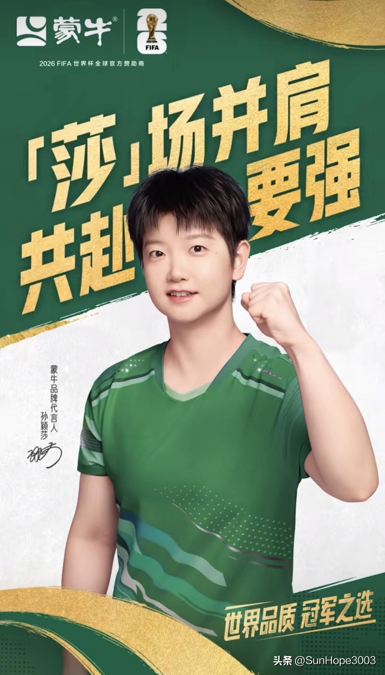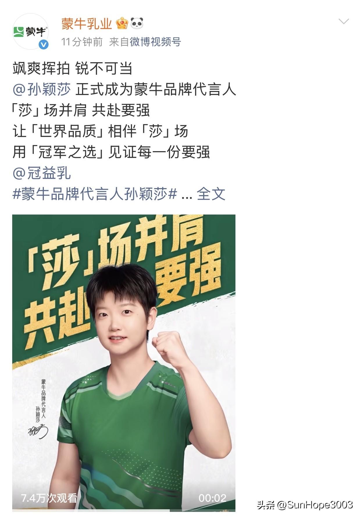 孙颖莎官宣成为蒙牛品牌代言人, 恭喜莎莎又一个集团品牌代言人,也是蒙牛的最高title。 蒙牛在11:04分,正式官宣, 飒爽挥拍,锐不可当。 莎莎是真的没时间拍,照片看起来不是新拍的。 绿色的小莎漂亮可爱。 今天即将出发去澳门参加世界杯, 一切顺利,加油莎莎。