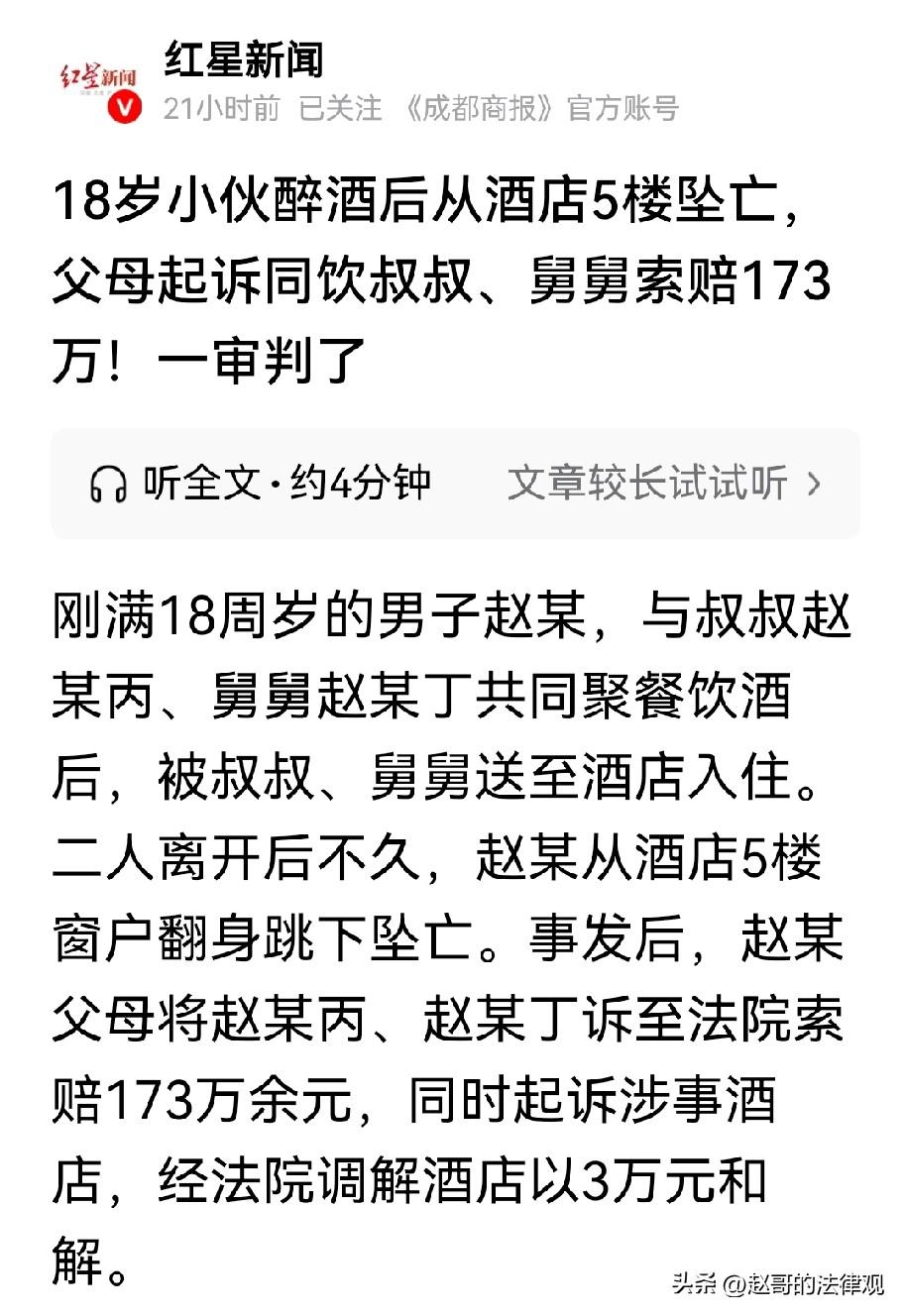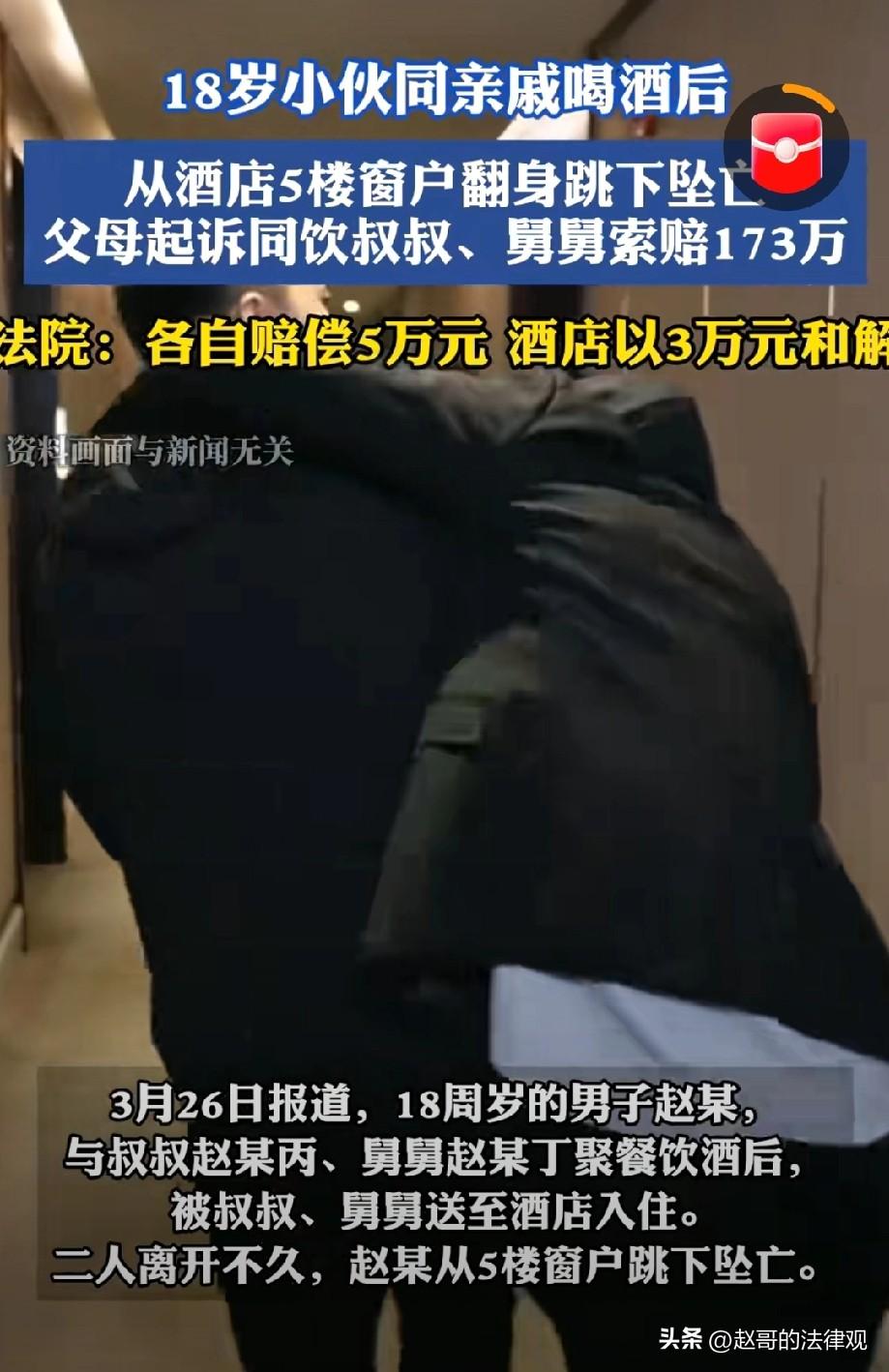 意外还是发生了!广东深圳,18岁的小伙,和自己的叔叔、舅舅一块喝酒,两位长辈看到他有点醉了,就直接给他开了一个房间,把他送到了酒店睡觉醒酒。不料,两人离开后,小伙开门出来,在走廊里敲其他客人房门,后来,竟在酒店5楼的窗户跳下坠亡。小伙父母痛不欲生,怨恨两位长辈没有照顾儿子,将两人告上法庭,要求赔偿各项损失173万元,法院这样判。 刚满18岁的赵某,本有着大把青春可以去挥霍,却在一场酒局后,生命戛然而止! 赵某是006后刚满18岁,2024年8月,晚上9点左右,他和叔叔赵某丙、舅舅赵某丁,相约在某酒店对面的餐馆吃饭。 期间3人推杯换盏,不知不觉喝了3瓶白酒,赵某自己就喝了大半瓶。 他的舅舅和叔叔,看到他有点醉了,就在酒店门口陪着他醒酒,看到他只想睡觉。 就直接在酒店给他开了一个房间。 两人搀扶着,把赵某送进了房,时间是8月24日0点18分。 酒店前台工作人员说,赵某来办理入住的时候,身上有股酒味,不过其他方面看着还算正常。 可谁能想到,危险正在悄悄逼近。 工作人员通过监控发现,另两人走后,赵某在5楼楼道里晃来晃去,还去敲其他房间的门,行为十分异常。 工作人员赶紧又上去,把他带回了房间。 然而,意外还是发生了! 赵某丙和赵某丁离开酒店,仅仅过了不到一个小时。 赵某就从酒店5楼走廊尽头的窗户翻身跳下,掉到相邻的停车场。 等被人发现的时候,他已经没了生命迹象。 赵某的父母得知这个噩耗后,悲痛欲绝。 他们怎么也想不明白,好端端的儿子,只是和两个至亲长辈喝了一场酒,咋就跳楼了呢? 期间儿子到底经历了什么?是不是受了太大的委屈? 悲痛之余,他们觉得儿子之所以会坠亡,和叔叔赵某丙、舅舅赵某丁,脱不了干系。 同时,涉事酒店也有责任。 于是,他们一纸诉状,把赵某丙、赵某丁告上了法庭,索赔173万余元,同时还起诉了涉事酒店。 诉讼期间,法院深入调查, 从证据中发现,赵某在饮酒后,确实已经处于行为失控的风险中。 他喝多了之后在楼道里乱晃、敲别人房门,这些行为都表明,他的意识已经不太清醒,随时可能做出危险的事情。 而赵某丙、赵某丁,作为共同饮酒的长辈,他们心里其实很清楚赵某已经喝醉了。 按常理说,他们不应离开这个大男孩,或者联系家属来照顾他。 再不行,安排一个专人陪护赵某,确保他不会出意外。 可是,他们什么都没有做,就这么把赵某丢在酒店里,自己离开了。 涉事酒店,虽然工作人员发现赵某行为异常后,把他带回了房间。 但没有采取有效的安全保障措施。 不过,在诉讼过程中,经法院主持调解,赵某的父母和酒店达成了和解。 酒店以3万元了结了这起纠纷。 现在,焦点就集中在了赵某丙和赵某丁身上。 他们觉得自己很冤枉,不就是一起吃了个饭、喝了点酒吗,怎么就要赔这么多钱呢? 他们可能觉得赵某已经是成年人了,应该对自己的行为负责,自己跳楼是他自己的选择,和自己没有关系。 法院认为,赵某丙和赵某丁作为长辈,和刚满18周岁的晚辈喝酒,有责任不让他喝多。 在明明知道赵某喝醉后,没看护好他,存在过错,所以应承担相应的民事赔偿责任。 但赵某已经18岁了,是完全民事行为能力人,对自己喝醉酒的后果,应有认知和控制能力。 他自主翻越窗户的行为,有着明确的目的和主动,所以对自己的死亡结果,要承担主要责任。 根据民法典第一千一百六十五条第一款:“行为人因过错侵害他人民事权益造成损害的,应当承担侵权责任”。 也就是说,如果一个人的行为存在过错,并且因为这个过错,导致了他人的民事权益,比如生命权、健康权等受到损害,那么这个人,就需要承担相应的法律责任。 这一起事件中,赵某丙和赵某丁两位长辈,明知道赵某刚刚成年,喝酒的时候,就应该劝他悠着点。 赵某喝醉酒后,两人要么将孩子送去医院,或者守在身旁。 就算把他交给父母,也不会出这样的事儿。 可两人却直接把他留在酒店,溜之大吉了。 不说孩子的父母要求他们赔偿,恐怕他们自己心里这个坎,也很难过去。 说白了,这就是两个长辈不作为。 赵某最终跳楼身亡,两人的的过错,与损害结果之间存在一定因果关系。 所以,孩子父母找他们要赔偿,一点都不冤。 最终,法院判决,赵某丙、赵某丁,各自赔偿赵某父母5万元。 对这个事,你是怎么看的呢?