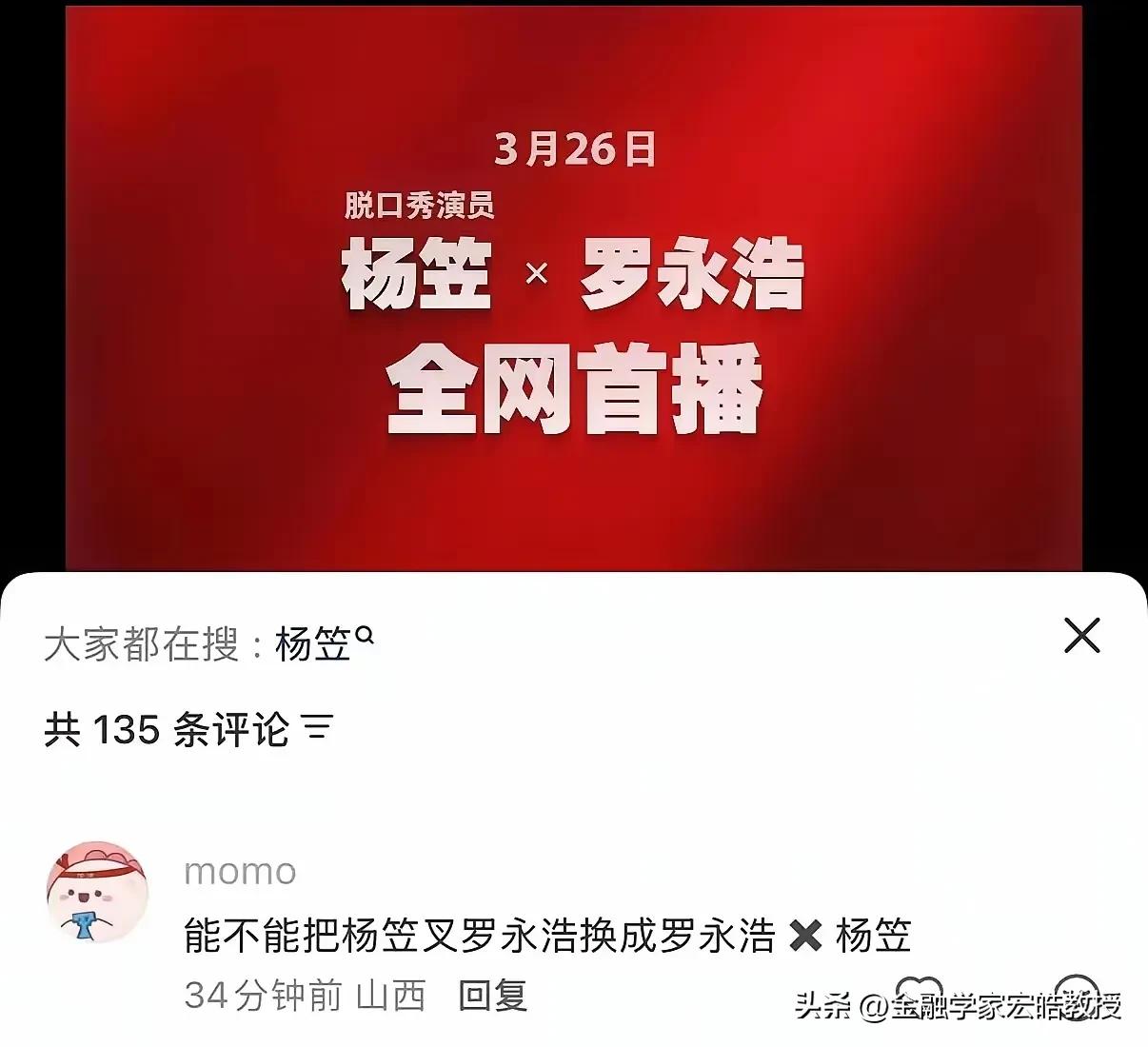 有人说,罗永浩这次跟杨笠对话是在失去他的“基本盘”,这个“基本盘”就是在大赢西贝后赢得的粉丝。其实,一直秉持正义感的老罗不是去救杨笠,就是大家合作赚流量而已。乱留言的网友一概都被老罗的“拉黑办”给拉黑了。 老罗一直是中立,客观的事实陈述者,前两天瑞幸找罗永浩拍当年的那个“超大杯”话题的广告就赢麻了。有网友说,流量是老罗一切言行的出发点和终极目标。