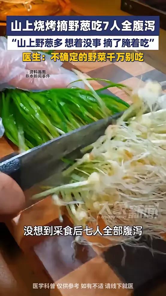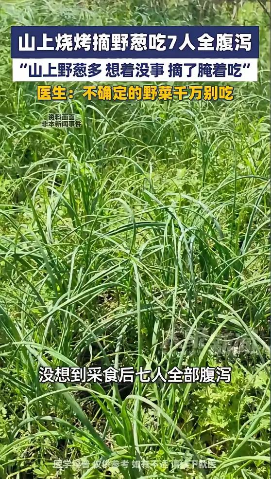 悲剧还是发生了!3月22日,河南驻马店,一男子和朋友去野炊烧烤,到了地点后发现没带葱,看到山上有野葱,就想着摘了腌着吃没事,没想到第二天,男子和朋友全部腹泻,赶紧捂着肚子去医院就诊!网友:这下后悔了吧! 男子与朋友约好周末去山上烧烤,提前备好了肉串、炭火、饮料,就等着到地方大快朵颐。结果到了现场一清点,发现最提味的葱给落下了。几个人正犯愁呢,眼尖的人一眼瞅见旁边山坡上长着一大片绿油油的野葱,看着跟家里种的小葱一模一样,叶子细长、葱白嫩白,闻着还有点葱香味。 有人当场就动了心,说山上的野葱纯天然,没打农药,摘点腌着吃,配烧烤绝了。其他人也没多想,觉得不就是个葱嘛,能出啥事,以前也听人说过野葱能吃,就跟着一起动手摘了起来。没一会儿就薅了一大把,当场就洗干净切了段,用盐、辣椒简单一腌,就着烤肉吃了起来,还夸这野葱比买的更冲更鲜。 一群人开开心心玩了一下午,满载着满足感回了家。可谁知道,第二天一早,麻烦就找上门了。先是男子肚子隐隐作痛,紧接着上吐下泻,没一会儿,一起吃野葱的7个人全中招了,一个个捂着肚子直冒冷汗,跑厕所跑到腿软,根本扛不住,只能赶紧结伴往医院跑。 到了医院一检查,医生直接点明问题出在那把野葱上。山上的野菜看着和可食用的葱相似,但根本没法100%确定品种,说不定是有毒的相似植物,也可能生长环境被污染,吸收了有害物质,吃了就会引发急性肠胃炎。医生也再次强调,不确定的野菜,千万不要随便采摘食用。 好好的一场烧烤局,就因为一把随手摘的野葱,变成了集体遭罪的闹剧。网友们看完都忍不住吐槽,这下是真的长记性了,可后悔也晚了。 很多人春天都爱去山里挖野菜,总觉得原生态的就是好的,抱着侥幸心理觉得“看着没事”“以前吃过”。可大自然里的植物,不是每一种都能入口,有些看着无害,实则毒性极强,就算是能吃的品种,也可能因为生长环境不干净,带着病菌和污染物。 再次提醒春天来了,满山遍野的野菜别随便乱采摘食用,别拿自己的健康赌运气,一次侥幸,可能就是一辈子的教训。 各位读者你们怎么看?欢迎在评论区讨论。