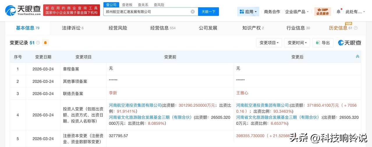 【郑州航空港汇港发展公司增资至约39.8亿 增幅约22%】 天眼查工商信息显示,近日,郑州航空港汇港发展有限公司发生工商变更,注册资本由约32.8亿人民币增至约39.8亿人民币,增幅约22%。 该公司成立于2015年7月,法定代表人为李清斌,经营范围包括建设工程施工、建设工程监理、建设工程设计、招投标代理服务、工程造价咨询业务、城市绿化管理等。股东信息显示,该公司由河南航空港投资集团有限公司、河南省文化旅游融合发展基金三期(有限合伙)共同持股。 天眼查信息:
