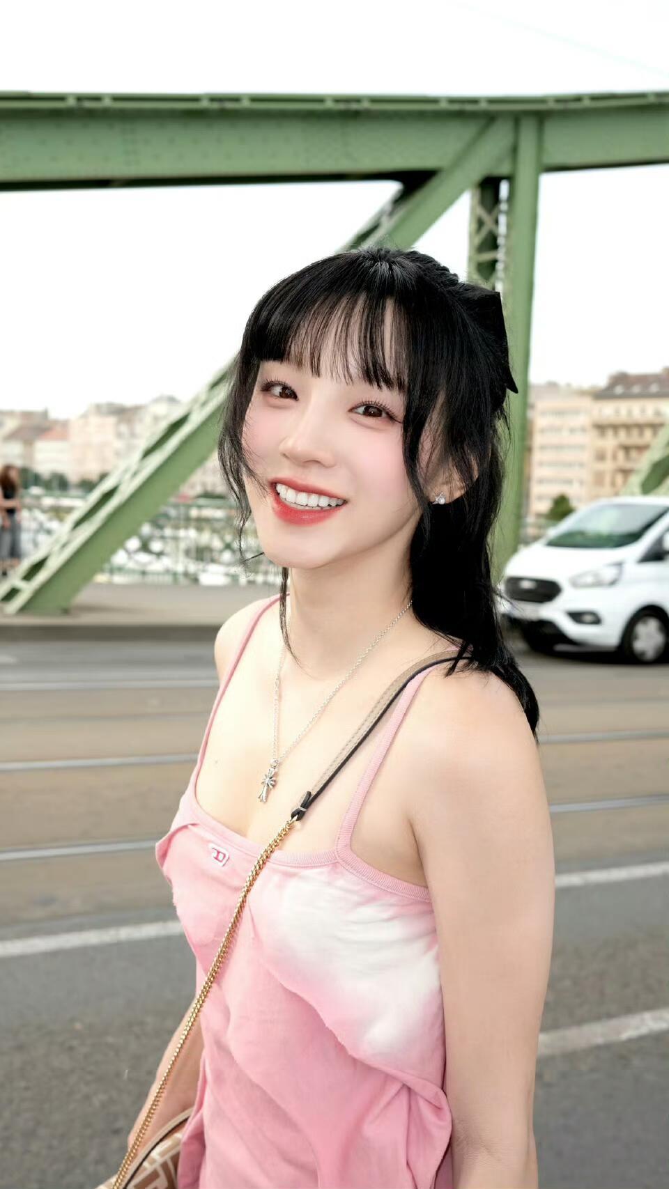 宋雨琦 绿色铁架托着风的形状 你把眼睛轻轻合上 让多瑙河的光 漫过粉裙的褶皱 漫过耳尖的碎发 长椅接住午后的慵懒 草叶在鞋边晃 你偏头望 把心事藏进托腮的手掌 风穿过发梢的蝴蝶结 把夏天的甜 揉进每一次眨眼 河畔的黄昏漫上来 你对着老城嘟起嘴 像要把整座布达的温柔 都含进唇间 链条包晃着细碎的光 和你一起