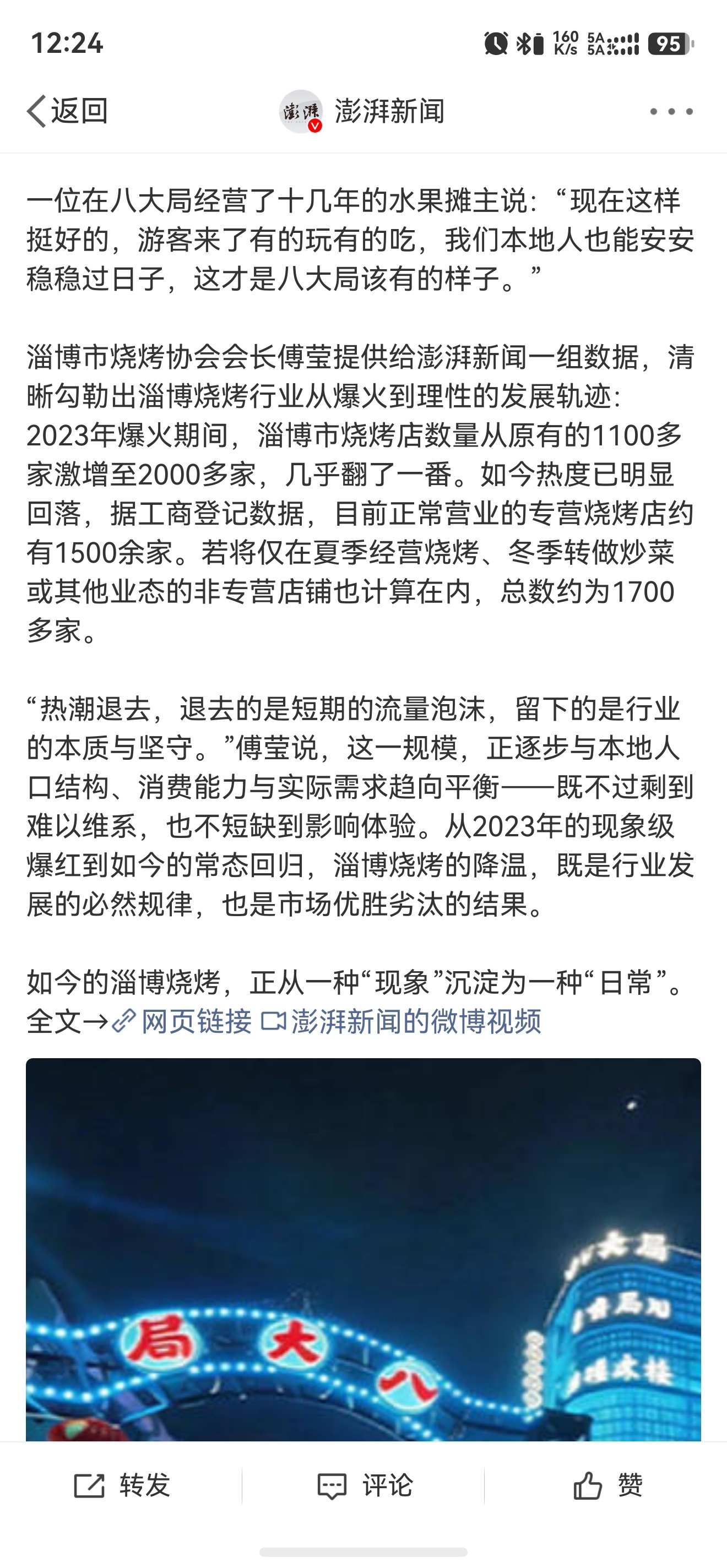 淄博烧烤退烧之后一位在八大局经营了十几年的水果摊主说:“现在这样挺好的,游客来了有的玩有的吃,我们本地人也能安安稳稳过日子,这才是八大局该有的样子。”
