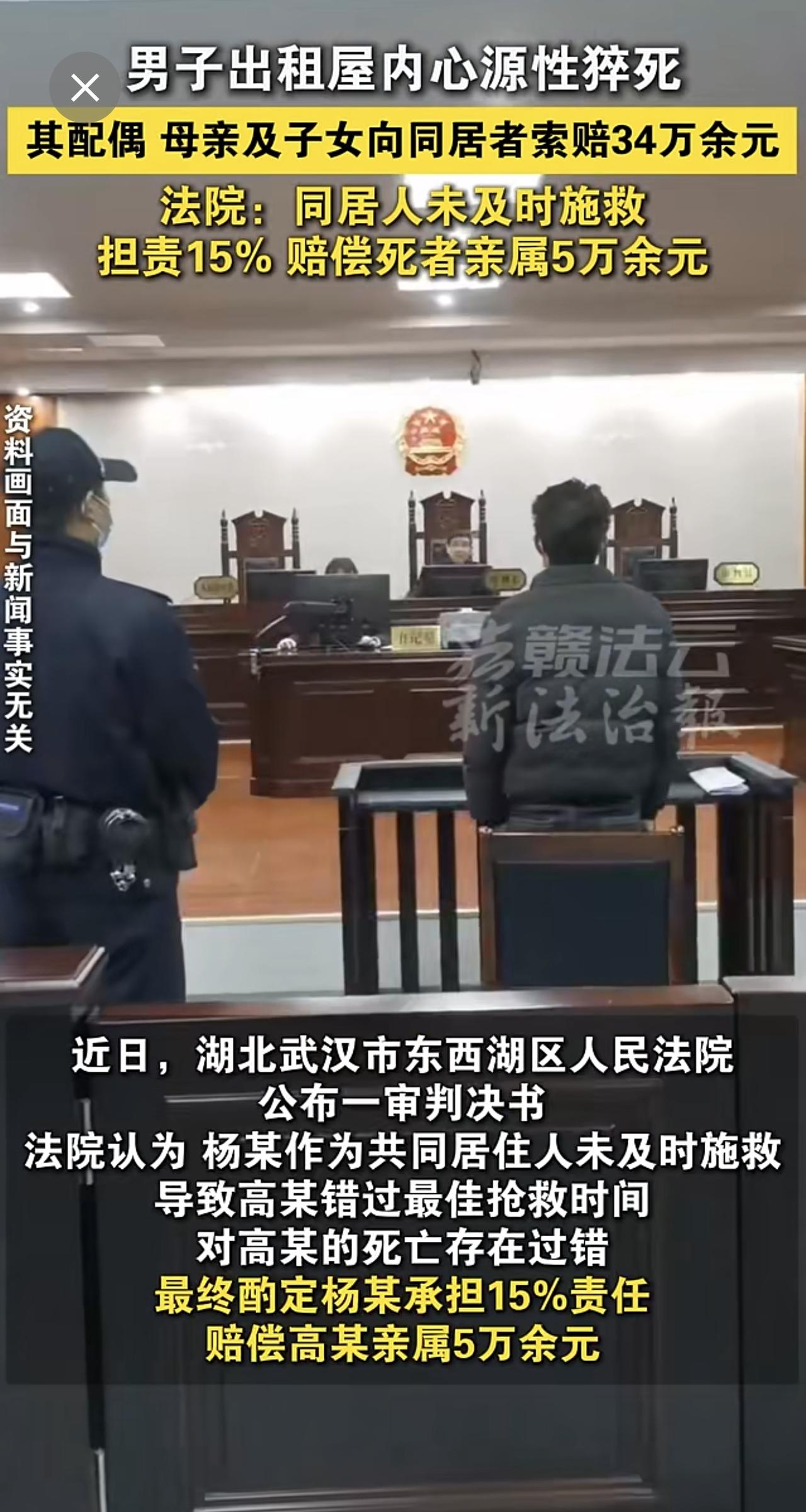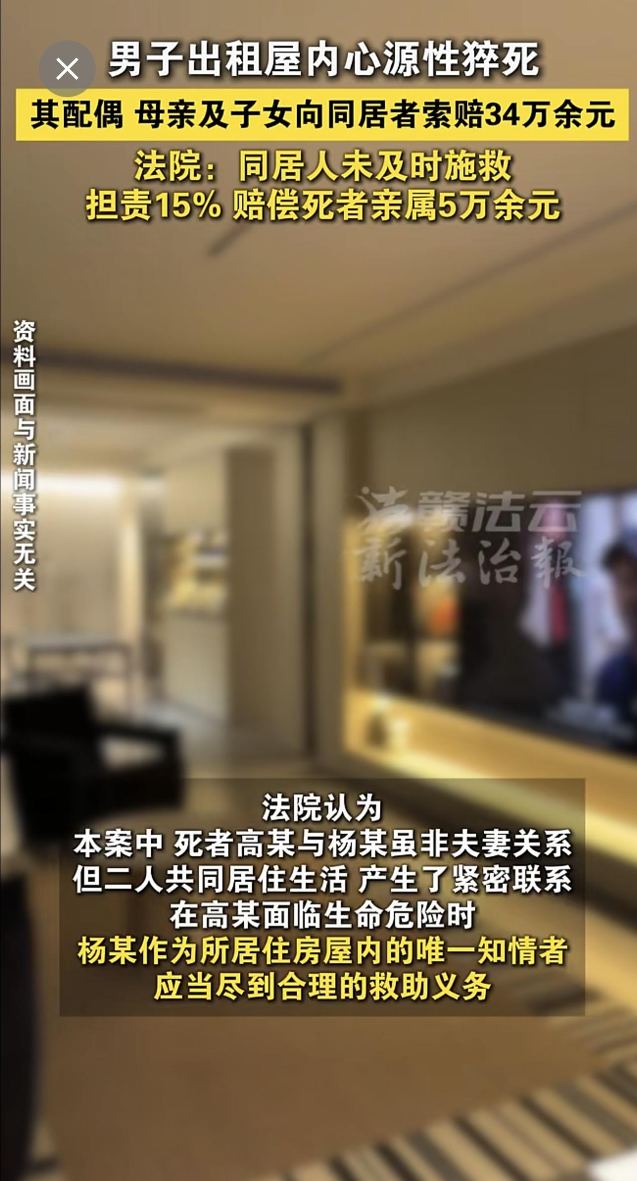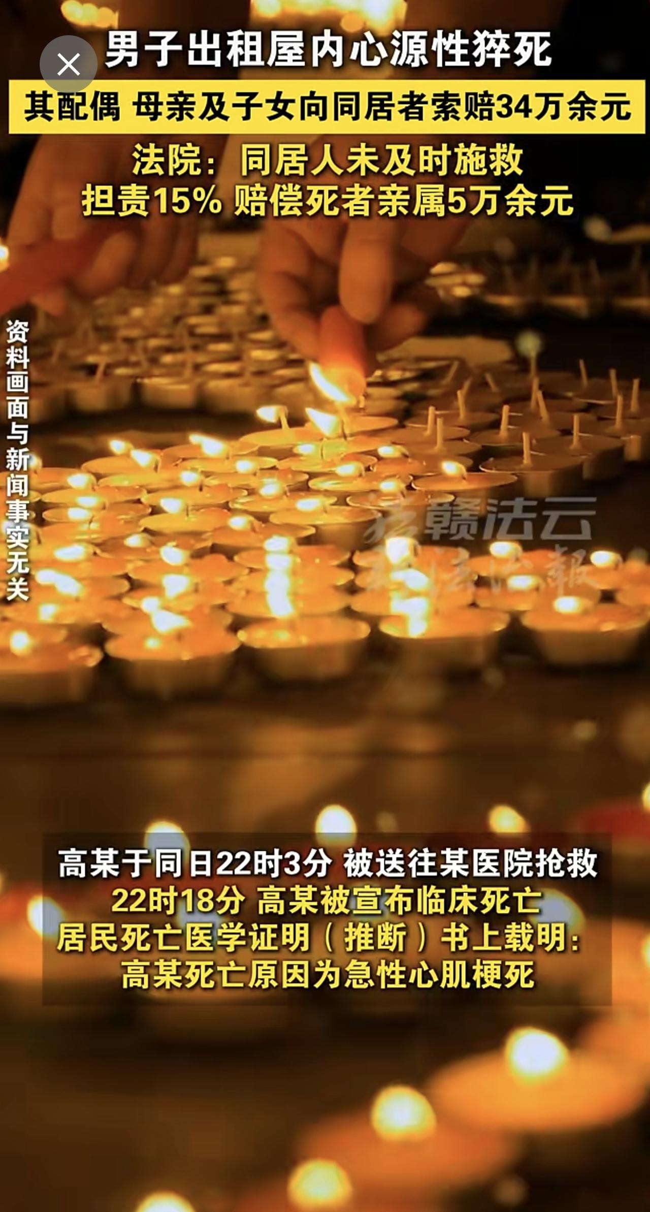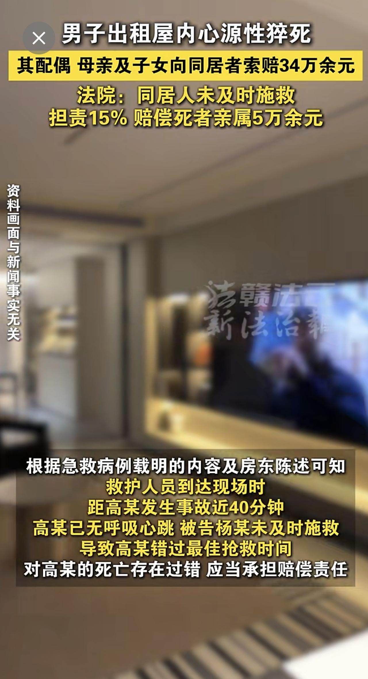 一男子出租屋内心源性猝死,其配偶、母亲及子女向同居者索赔34万余元。法院:同居人未及时施救,担责15% 赔偿5万余元。