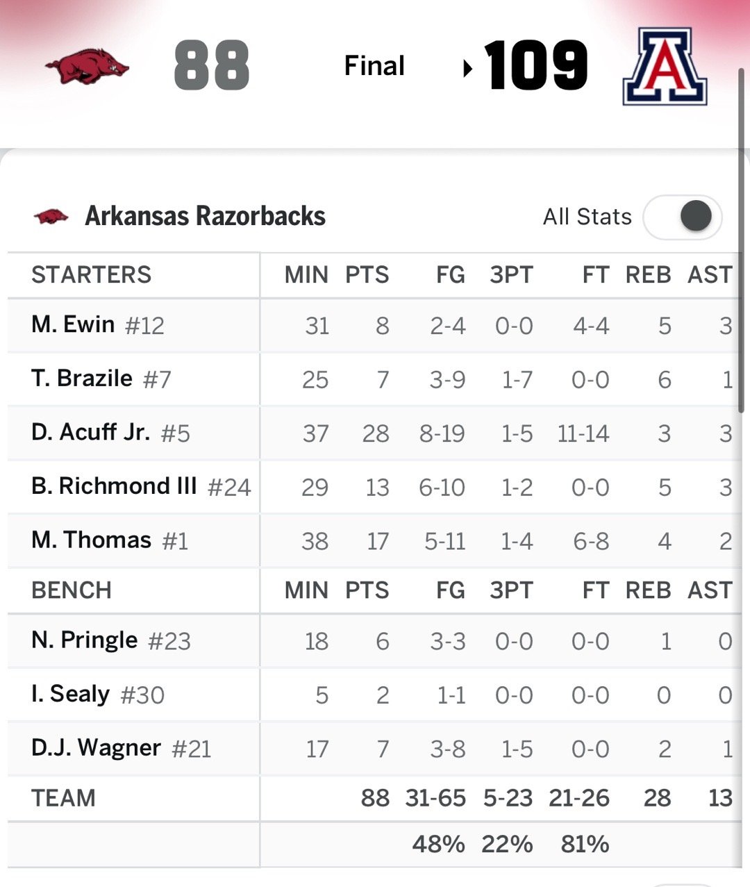 阿肯色88-109不敌亚利桑那,止步16强。来自阿肯色的热门新秀阿卡夫砍下28分