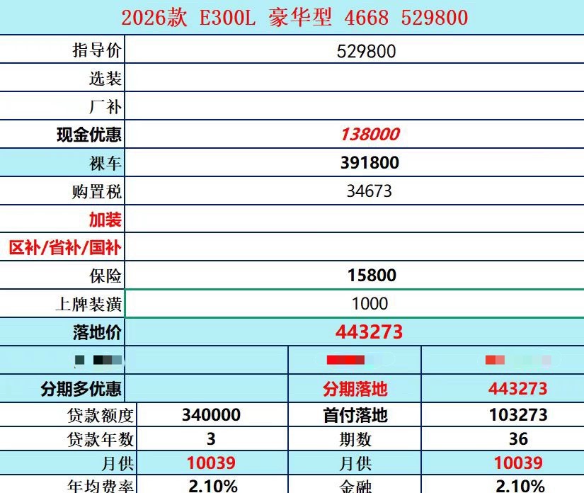 正好给你们看下做奔驰金融3年分期E300L豪华的价格,这个价格目前来讲还是很权威的,44.3万落地