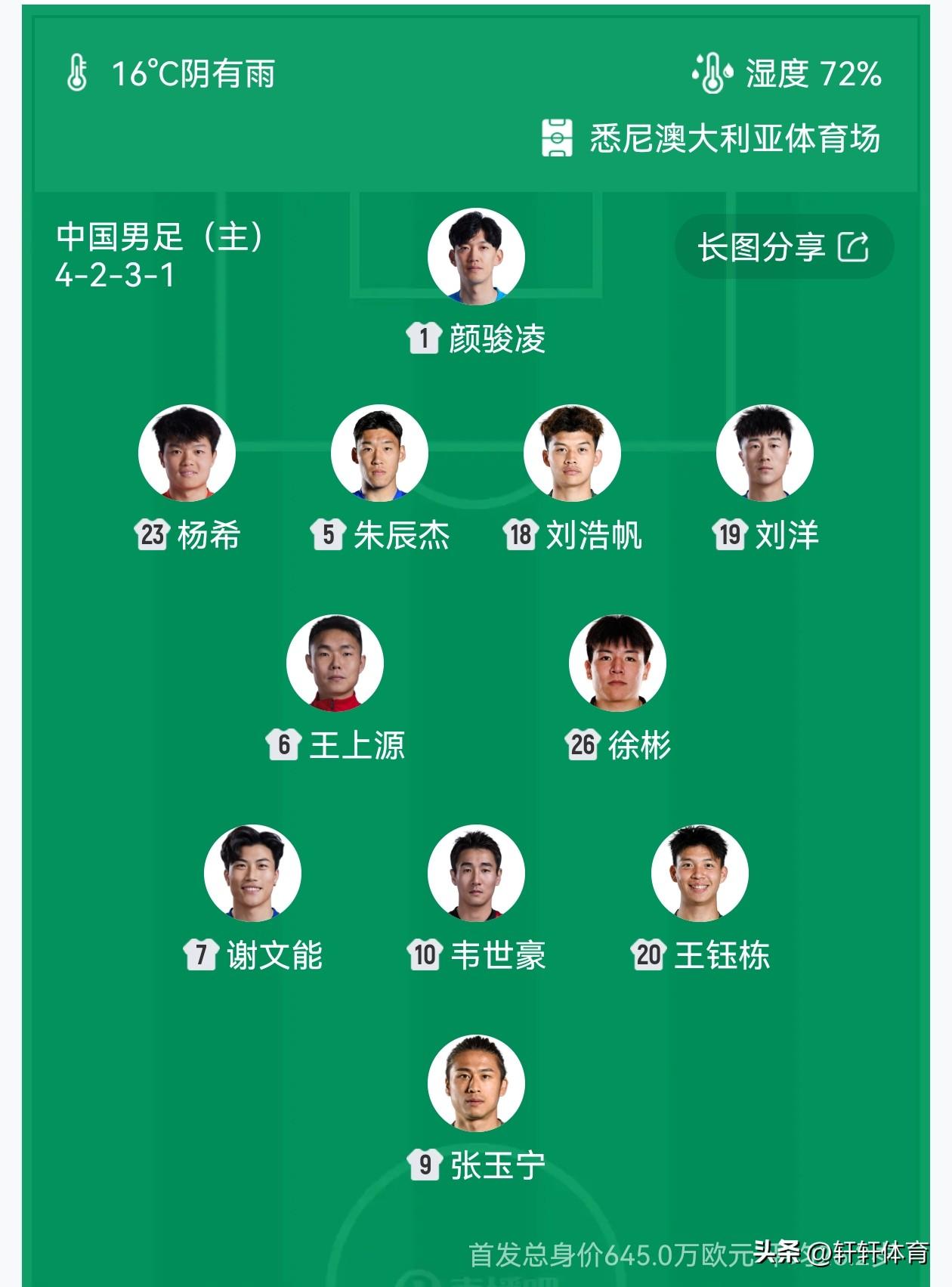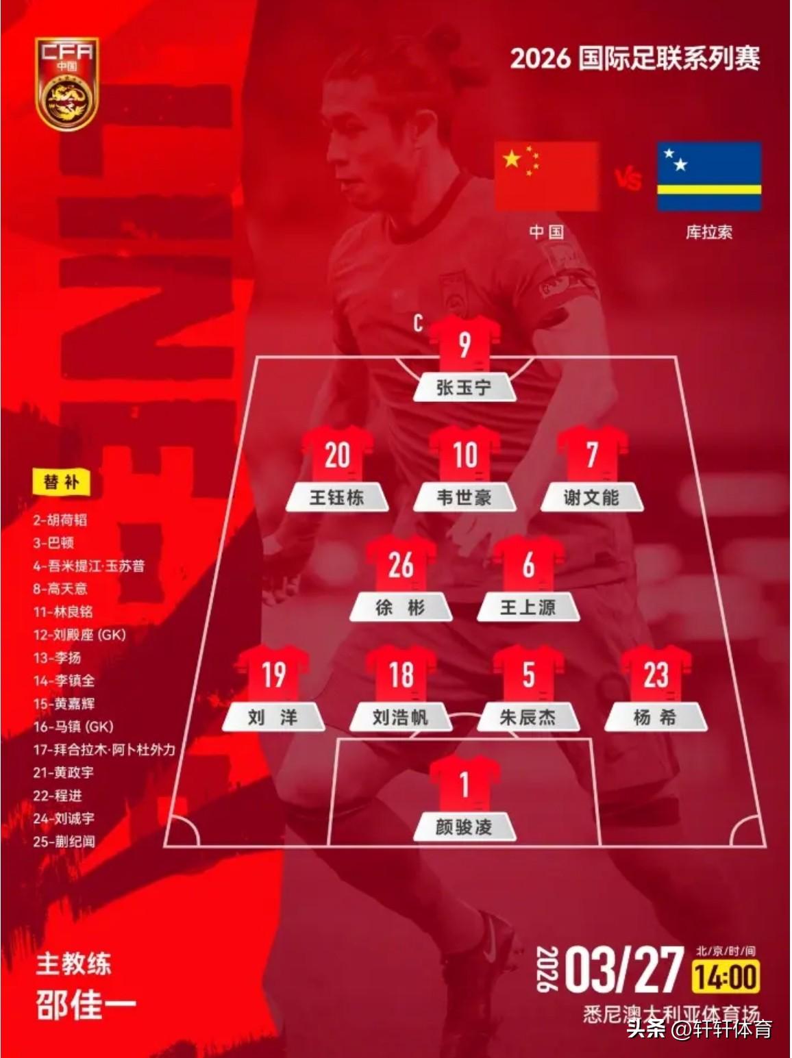 国足对阵库拉索的首发阵容已经出炉,本场比赛国足主打4-2-3-1阵型,后场4人分别是23号杨希,5号朱辰杰,18号刘浩帆,19号刘洋,中场6号王上源,26号徐彬,攻击中场7号谢文能,10号韦世豪,20号王钰栋,突前前锋9号张玉宁。 本场比赛有4名U23球员首发登场,刘浩帆,徐彬,杨希,王钰栋。 同时杨希与徐彬完成国家队首秀 主教练邵佳一也是首次带领国足征战正式比赛,主打阵容4-2-3-1老将压阵,年轻球员边路冲击。