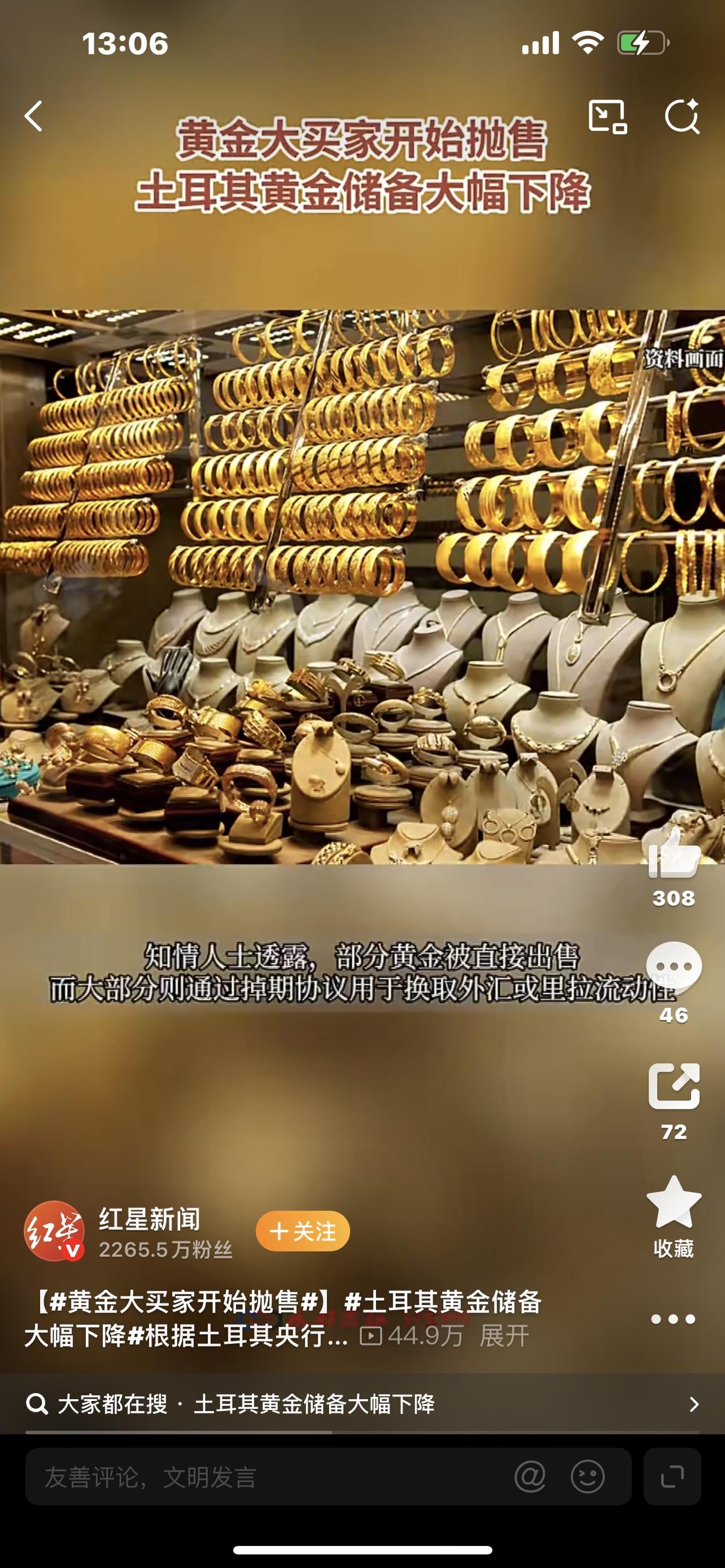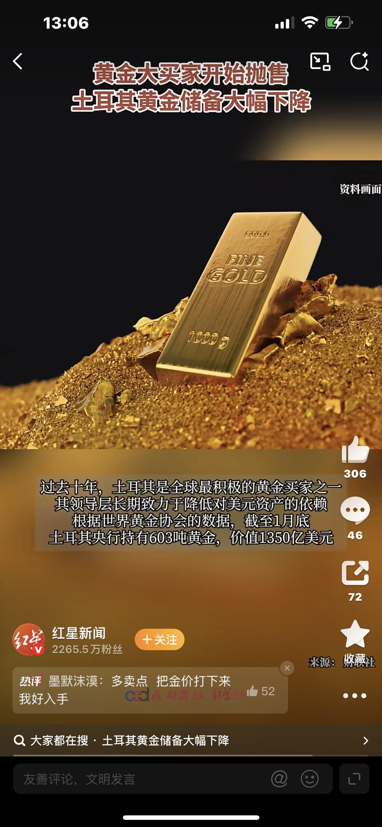突发!黄金大买家疯狂抛售!两周狂抛58.4吨,金价大跳水,有人一夜亏几千! 炸翻金融圈!全球黄金市场突现惊天转向!曾经疯狂扫货的黄金大买家,突然反手大规模抛售,直接引爆金价剧烈震荡,无数投资者瞬间慌了! 过去很长一段时间,各国央行疯狂囤金,金价一路走高,人人都说“黄金保值”“闭眼入”。中国大妈更是冲在前面,买金条、存金饰,把黄金当成家庭财富的“压舱石”,谁也没料到,风向说变就变。 作为过去十年最积极的黄金买家,土耳其两周狂抛58.4吨黄金,价值超80亿美元,直接打破市场平衡。受此影响,金价大幅跳水,国内金店价格同步下跌,不少高位入场的人,一夜之间账面缩水,亏得心疼。 很多人懵了:不是说黄金永远避险吗?怎么也会大跌? 真相很现实:这次抛售是为了缓解外汇压力、稳定金融市场,属于应急调仓,并非黄金失去价值。但这也给所有人敲响警钟:没有只涨不跌的资产,盲目追高必吃大亏。 对于咱们普通人,这波震荡太有警示意义。 买首饰的,不用慌,长期佩戴、传承无所谓短期涨跌; 想投资的,别梭哈、别杠杆,分批入场最稳妥; 指望炒黄金一夜暴富的,趁早清醒,金融市场从来都是镰刀快过贪心。 黄金没有神话,保值不靠冲动,靠的是理性与耐心。 守住钱袋子,不跟风、不盲从,比什么都重要。黄金价值分析 黄金后市分析 黄金还能回调 金价回收行情 黄金避险行情