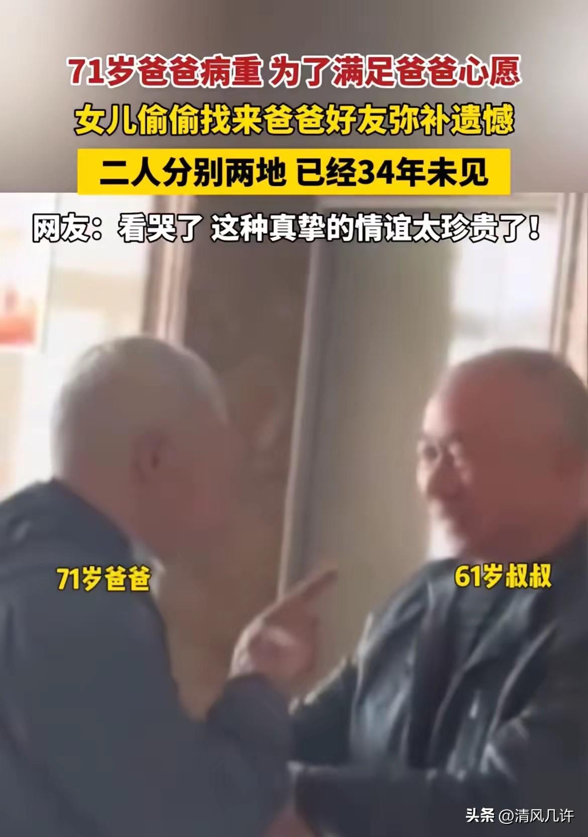 泪目了!河南一位71岁父亲病重,女儿为了满足爸爸心愿,偷偷找来父亲34年未见的好友,网友们纷纷表示:这种真挚的情谊太珍贵了。 这位71岁的父亲姓毛,去年10月被确诊喉癌,手术后喉部全切,再也发不出声音。 从那以后,他总坐在病床上发呆,偶尔对着窗外出神,女儿毛雪银看在眼里,疼在心上。她知道,父亲心里藏着一个没说出口的心愿——见见34年没见的老伙计胡志伟。 毛雪银从小就听父亲讲过,年轻时他和胡志伟在北京相识,两人志趣相投,父亲爱画画、吹口风琴,胡志伟会弹吉他,凑在一起总有说不完的话。 1993年,胡志伟因家庭变故心情低落,父亲特意把他接回河南老家住了一年多,那段日子是两个年轻人最踏实的时光。后来胡志伟要回去上班,两人在车站挥手告别,谁也没料到,这一别就是34年。 这些年里,两人断了所有联系,父亲总在夜深人静时翻出旧照片,指尖摩挲着照片里年轻的面孔,却从不说要寻找。 直到病重后,他连写字都费力,才在小黑板上歪歪扭扭写下“想志伟”三个字。毛雪银看着那三个字,眼泪一下子就掉了下来,她瞒着父母,悄悄在网上发了求助帖,把父亲的心愿和两人的过往写得清清楚楚,希望能找到胡志伟的下落。 帖子发出后,不少热心网友帮忙转发,没过几天就有人提供了疑似胡志伟的联系方式。 毛雪银抱着试试的心态拨通电话,电话那头传来熟悉的乡音,她刚报出父亲的名字,对方就激动得声音发颤,没等她说完,就主动提出要打钱给父亲治病,还说不管多远都要过来看看。 3月24日那天,毛雪银悄悄把胡志伟接到了医院。她没提前告诉父亲,只想给这个病重的老人一个惊喜。当胡志伟推开病房门的那一刻,原本靠在床头的父亲猛地坐直了身子,眼睛死死盯着门口的人,嘴唇动了动,却发不出一点声音。 胡志伟也愣了几秒,随即快步走上前,伸出手想去碰父亲的肩膀,又怕碰疼了他,最后只是轻轻握住父亲的手。父亲的手很凉,却紧紧攥着胡志伟的手不肯松开,他拿起枕边的小黑板,颤巍巍地写下“你来了”三个字,粉笔灰簌簌往下掉,字里行间全是藏了34年的激动。 胡志伟看着黑板上的字,又看看父亲脖子上的手术疤痕,眼眶一下子红了。 他坐在床边,絮絮叨叨地讲这些年的生活,讲自己的家人,讲当年分别后找过父亲好几次,却都没找到消息。父亲不能说话,就盯着他的脸,时不时在小黑板上写几个字回应,有时候写得太急,字都歪歪扭扭的,胡志伟却总能一眼看懂。 病房里的其他人都悄悄退了出去,把空间留给这对跨越34年重逢的老友。毛雪银站在门外,听着里面断断续续的说话声和写字声,眼泪止不住地流。她想起父亲生病后从来没笑过,那天却对着胡志伟露出了久违的笑容,像个得到糖的孩子。 胡志伟在医院待了整整一天,直到傍晚才起身离开。临走前,他拉着父亲的手说,以后会常来看他,就算不能见面,也会经常打电话。父亲在小黑板上写下“保重”两个字,目送着胡志伟的背影消失在走廊尽头,才慢慢躺回床上,脸上还带着满足的笑意。 这件事被毛雪银发到网上后,很快就感动了无数网友。有人说,34年的时光没冲淡这份情谊,反而让它变得更厚重;有人说,女儿的孝心和老友的牵挂,凑成了最动人的画面;还有人说,这才是真正的朋友,不管分开多久,一见面还是当年的模样。 其实,这份珍贵的情谊里,藏着的不只是两个老人的半生牵挂,还有女儿对父亲的孝心,是普通人对温暖和陪伴的渴望。在快节奏的当下,这样跨越时间和距离的重逢,更显得格外难得,也让我们明白,真正的情谊从来不会被岁月打败,只会在时光里慢慢沉淀,成为生命里最温暖的光。 各位读者你们怎么看?欢迎在评论区讨论。