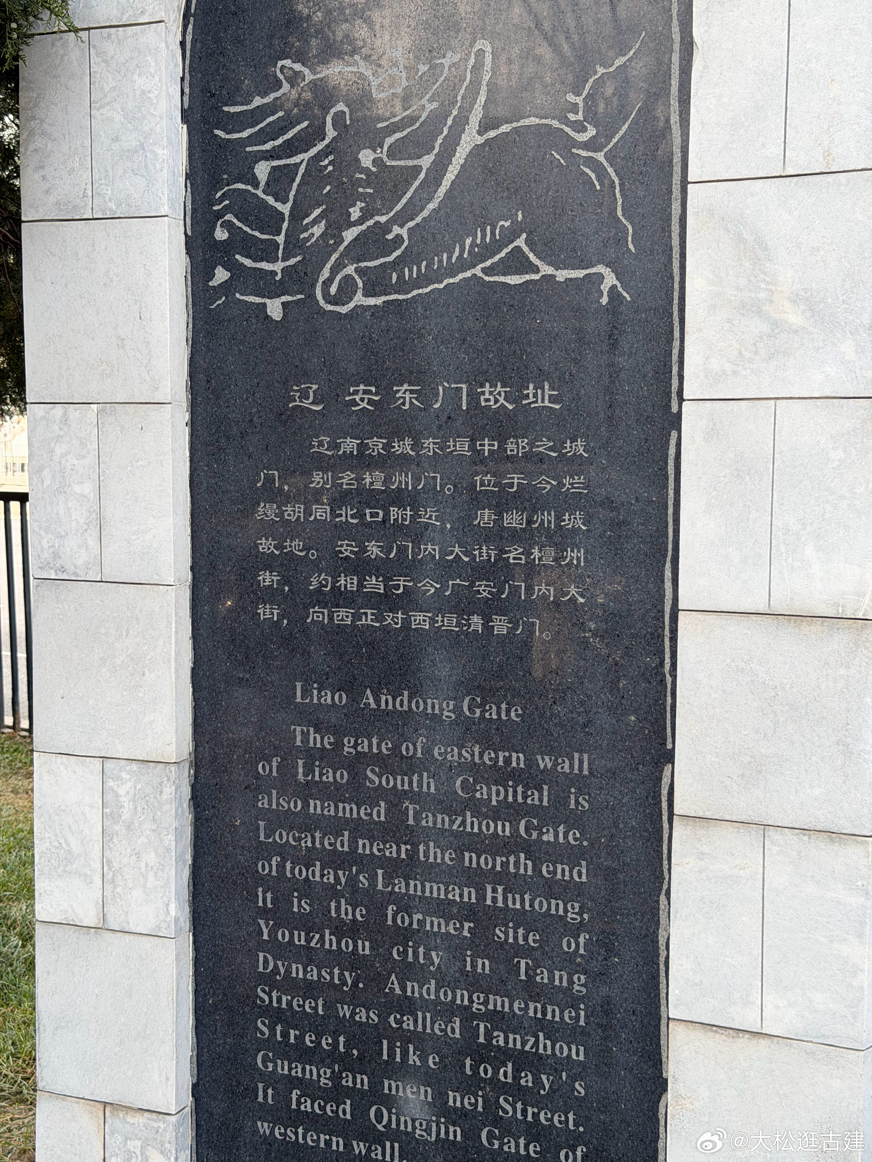 辽南京·安东门 安东门为辽南京东门之一,其南面还有迎春门。安东门内有檀州街,直通南京城西门清晋门。檀州街横亘于南京城中,街两侧大型寺院非常多,如大悲阁。圣宗有一年于大悲阁中避雨,后改大悲阁为圣恩寺。 安东门故址在今菜市口西侧,其南面为烂缦胡同。而烂缦胡同为南京城东城垣外城壕的位置。安东门周边有大悯忠寺,即今法源寺。悯忠寺始建于唐,辽代扩大规模称大悯忠寺。辽代,大悯忠寺扩建活动至少有四次,分别在穆宗(一次),圣宗(一次),道宗(两次)。悯忠寺中有观音阁,佛塔,佛殿等大型建筑,遗憾的是如今已全无。雍正年间改为法源寺。历史