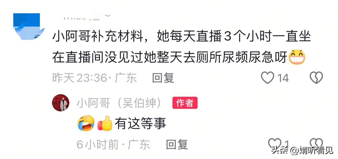 网友甲:小阿哥补充点情况,她每天直播3小时,一直坐在直播间,没见她频繁去厕所,哪来的尿频尿急啊!