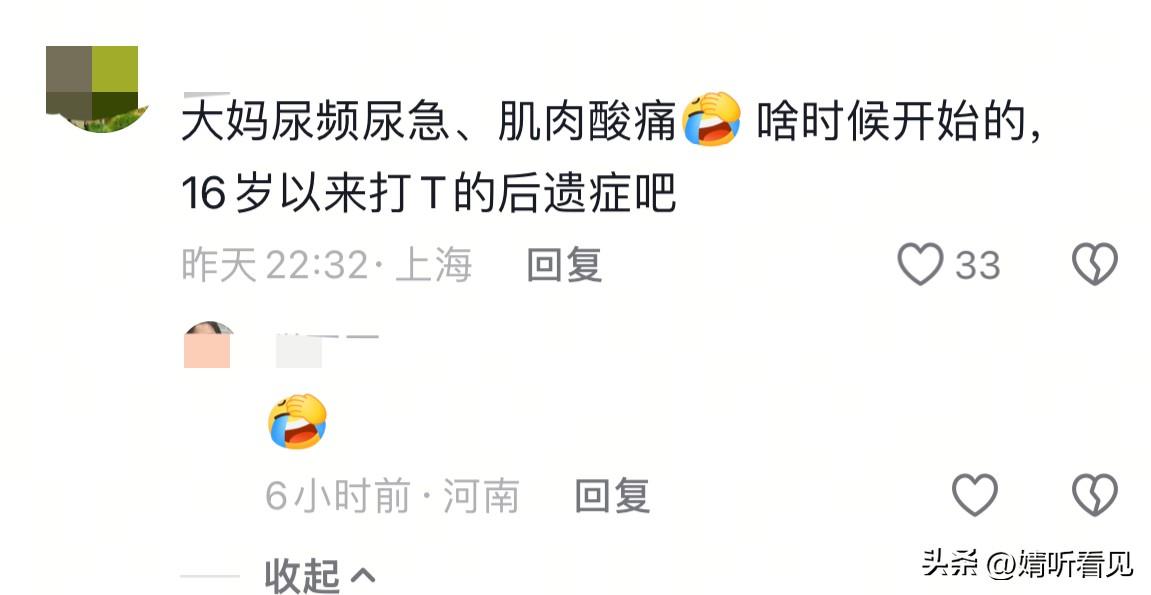 网友乙:大妈这尿频尿急、肌肉酸痛,啥时候开始的,不会是16岁打T留下的后遗症吧!