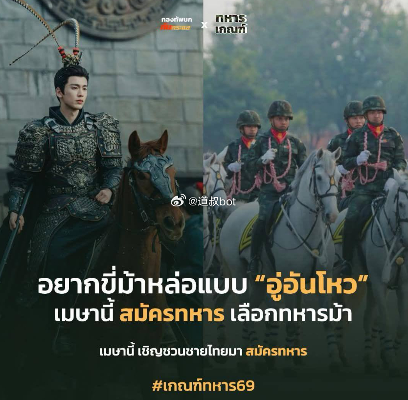 泰国在社交媒体发布了一则征兵宣传海报,直接引用《逐玉》中的剧照,海报文案写道:“想像武安侯一样帅气骑马吗?今年四月,报名参军,选择骑兵部队。”张凌赫也是好起来了。