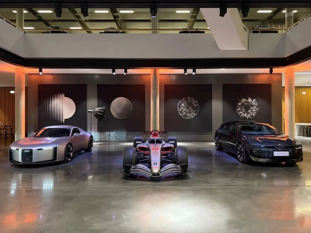 奥迪德国总部放了什么车Concept C概念车、F1 R26赛车、AUDI E5 Sportback三款车型并列陈列,三台车分别代表设计、科技、未来。