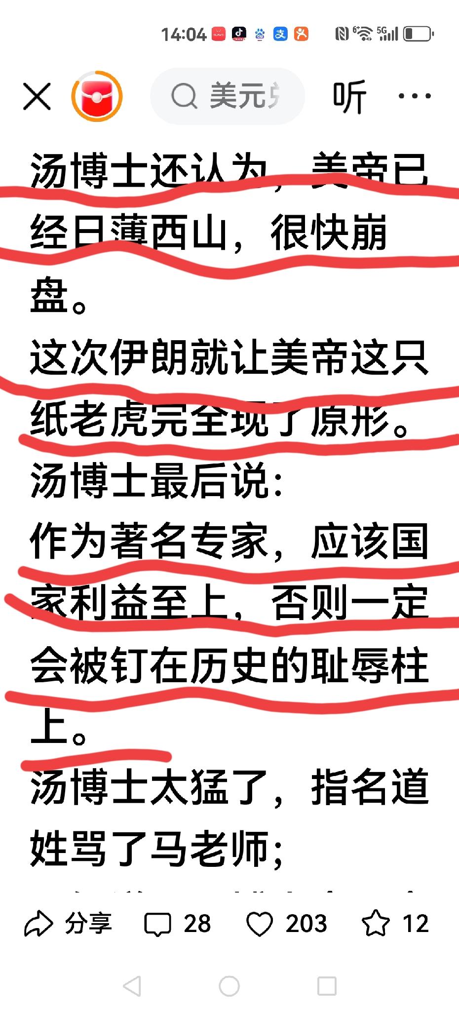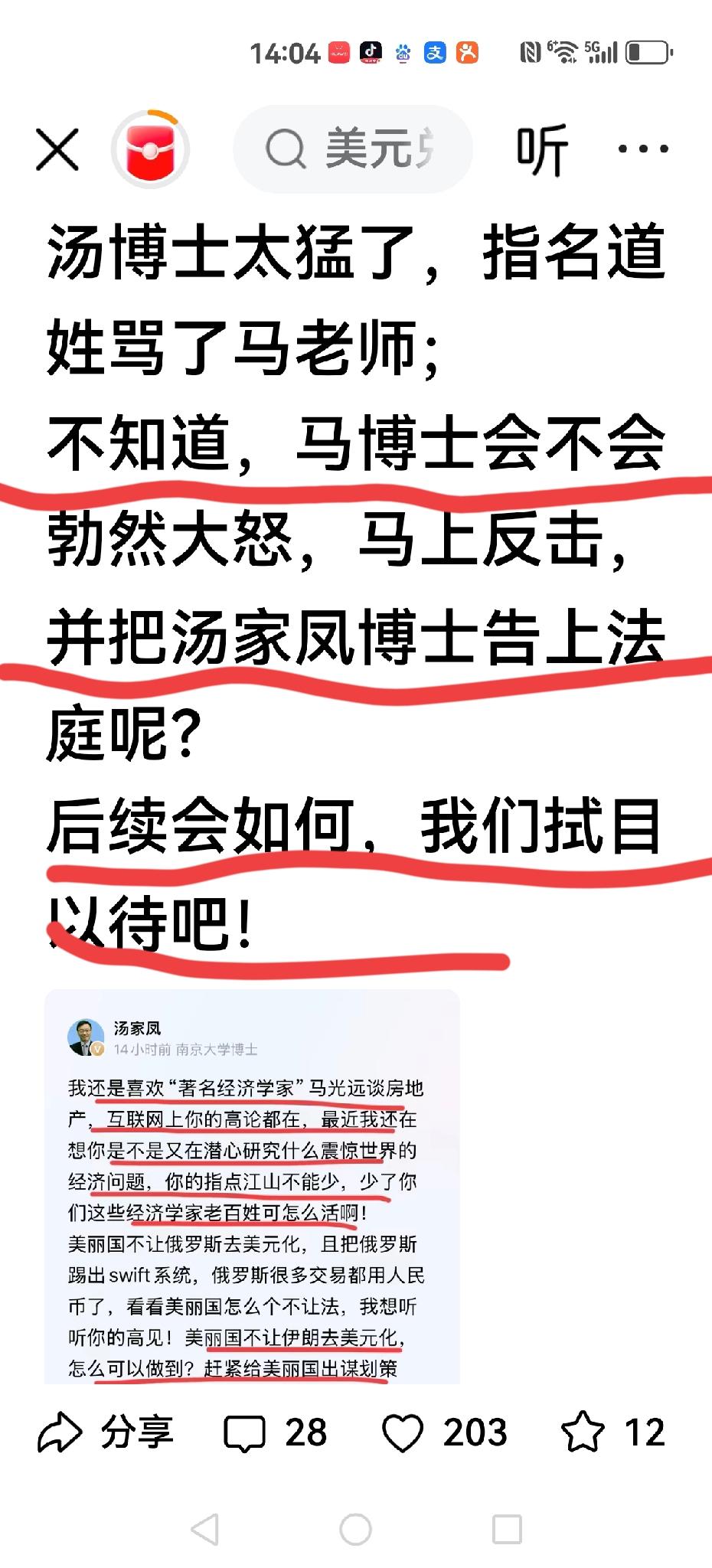 【去美元化引发争议】 自从马光远驳斥“去美元化”,还举例萨达姆逃跑都带着美元,没听说带黄金。 引来一位汤博士强烈反击: 这次美入侵伊朗,彻底暴露崩溃的一面,俄罗斯,伊朗用人民币怎么了? 这位房地产学者将会钉在历史耻辱柱上。 网友们都在静等马光远反击,不知这场较量如何收场?