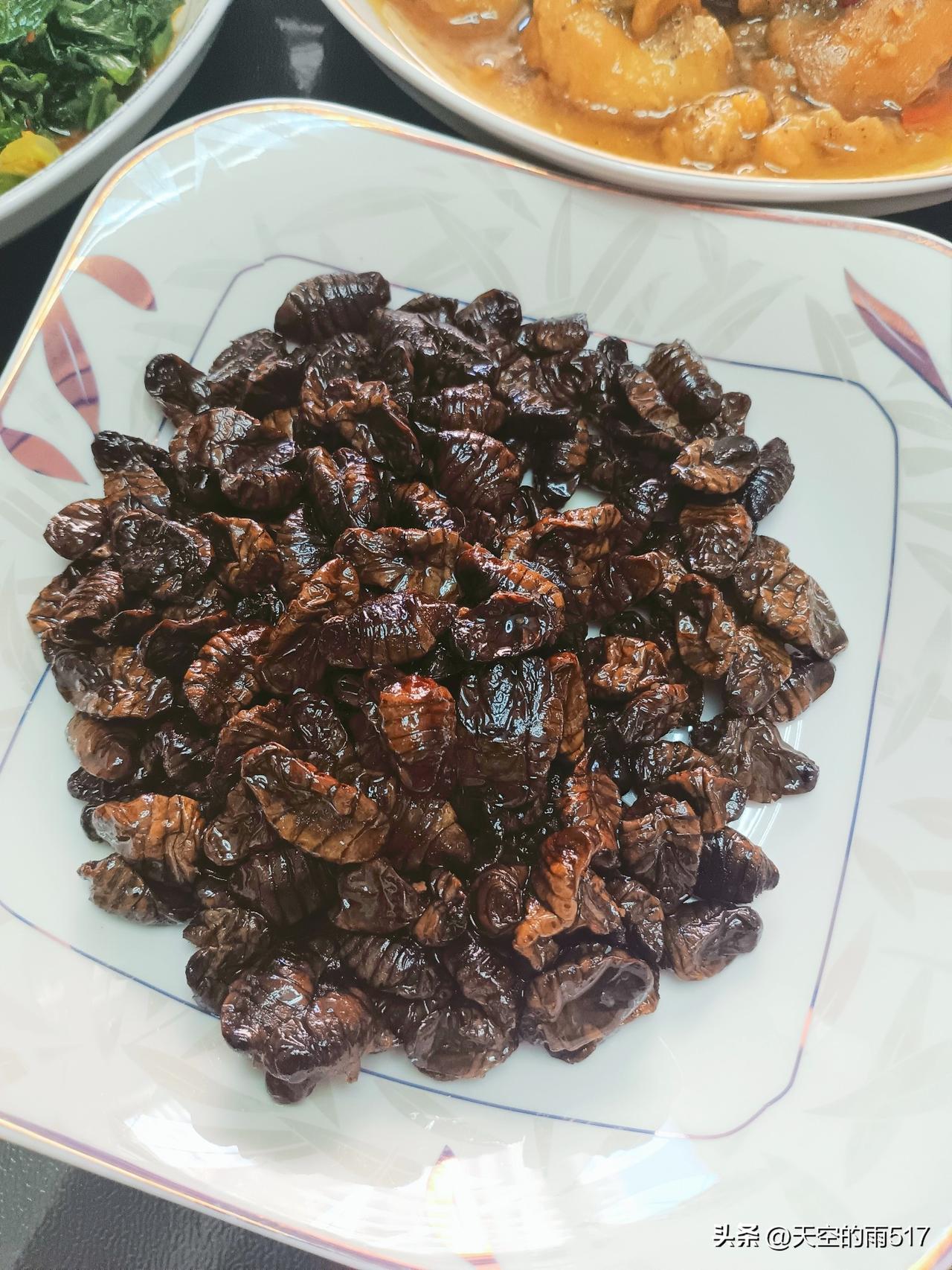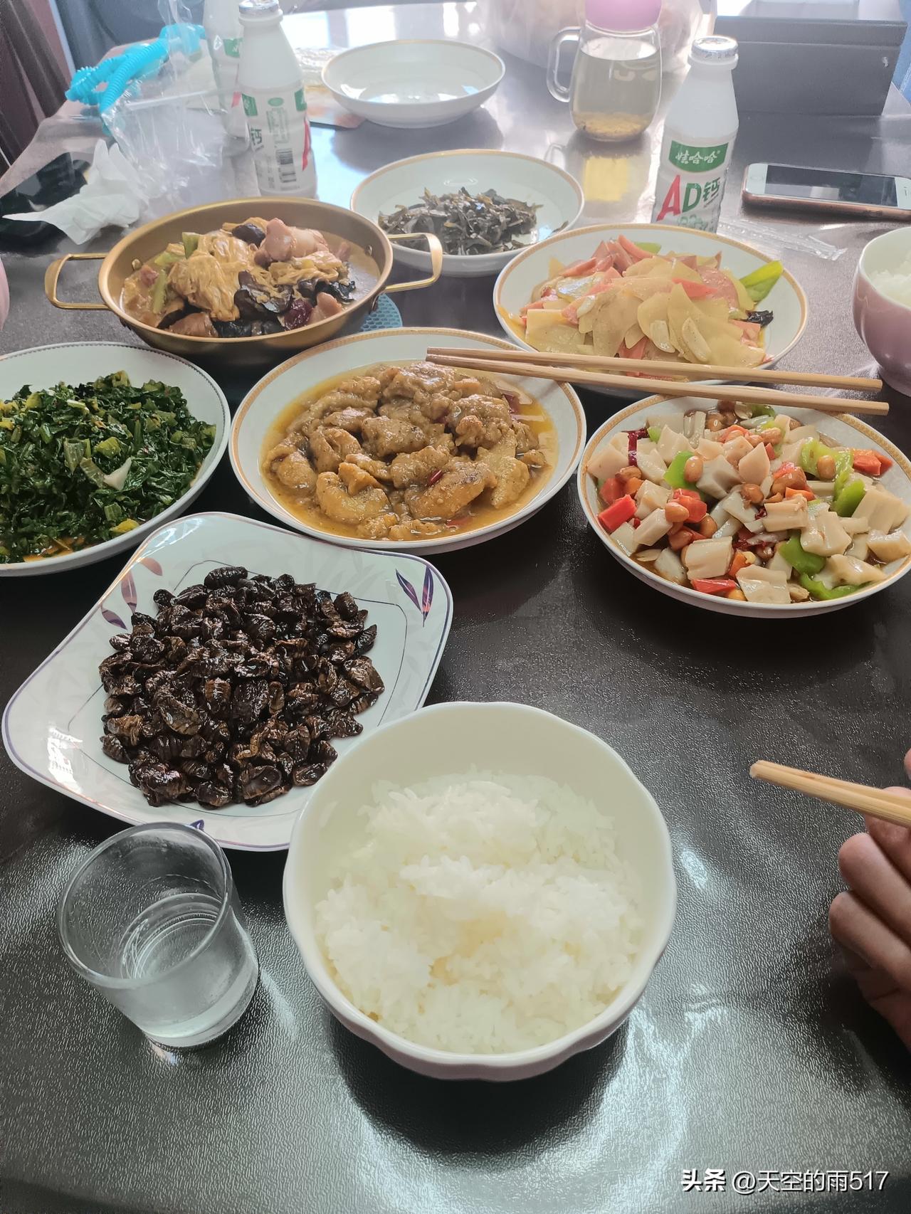 今天中午饭,简简单单几个菜。有一个是老婆在网上买的蚕蛹,看见这个下酒菜随口小酌一杯。