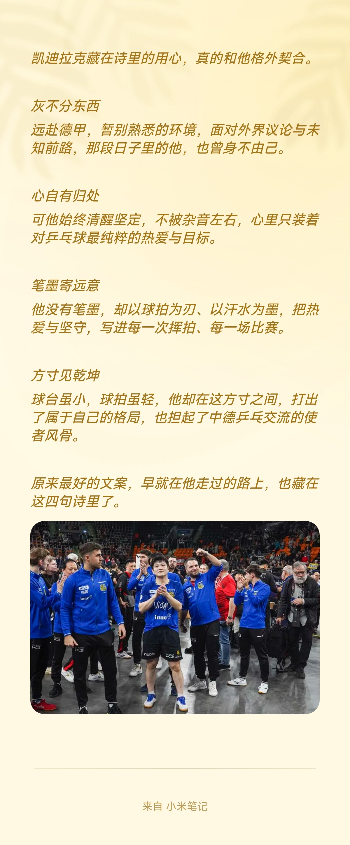 樊振东与凯迪拉克不语,只是一味地向外输出东方文化。以行动传递东方风骨与格局。“笔