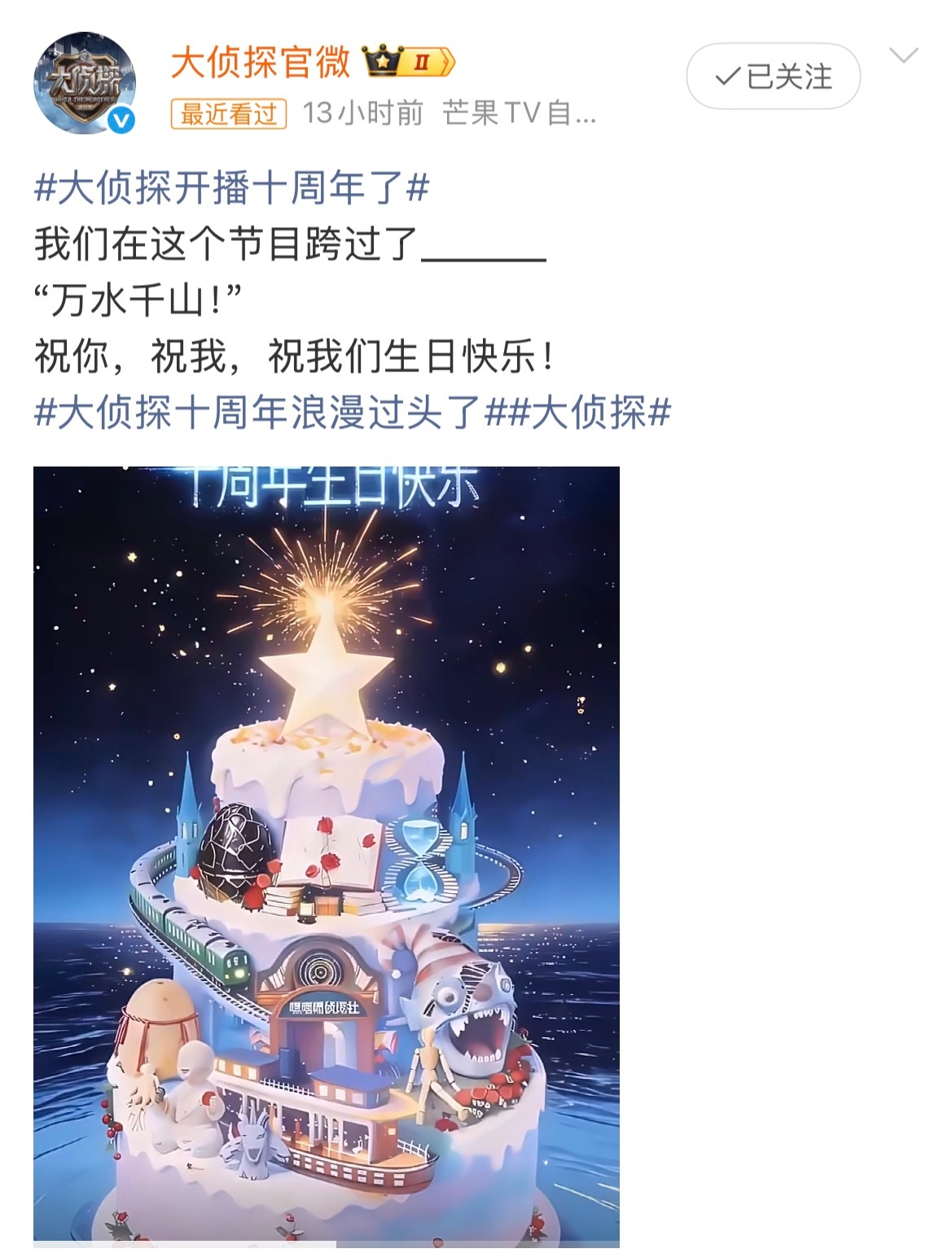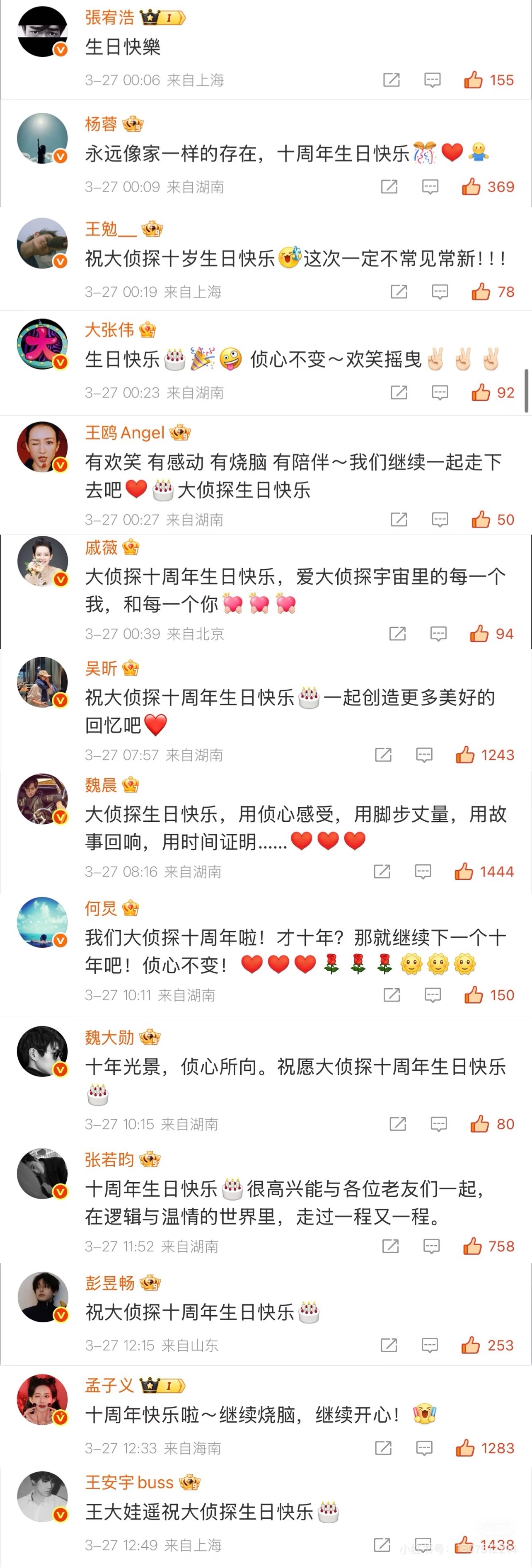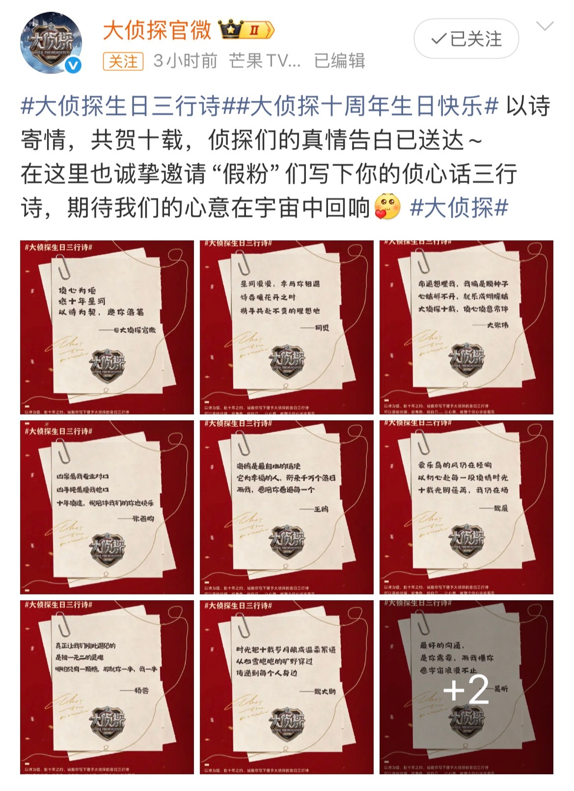 好多明星祝大侦探开播十周年 好多明星祝大侦探十周年快乐 好多明星祝大侦探开播十周年快乐哇时间过得真快,大侦探十周年快乐~