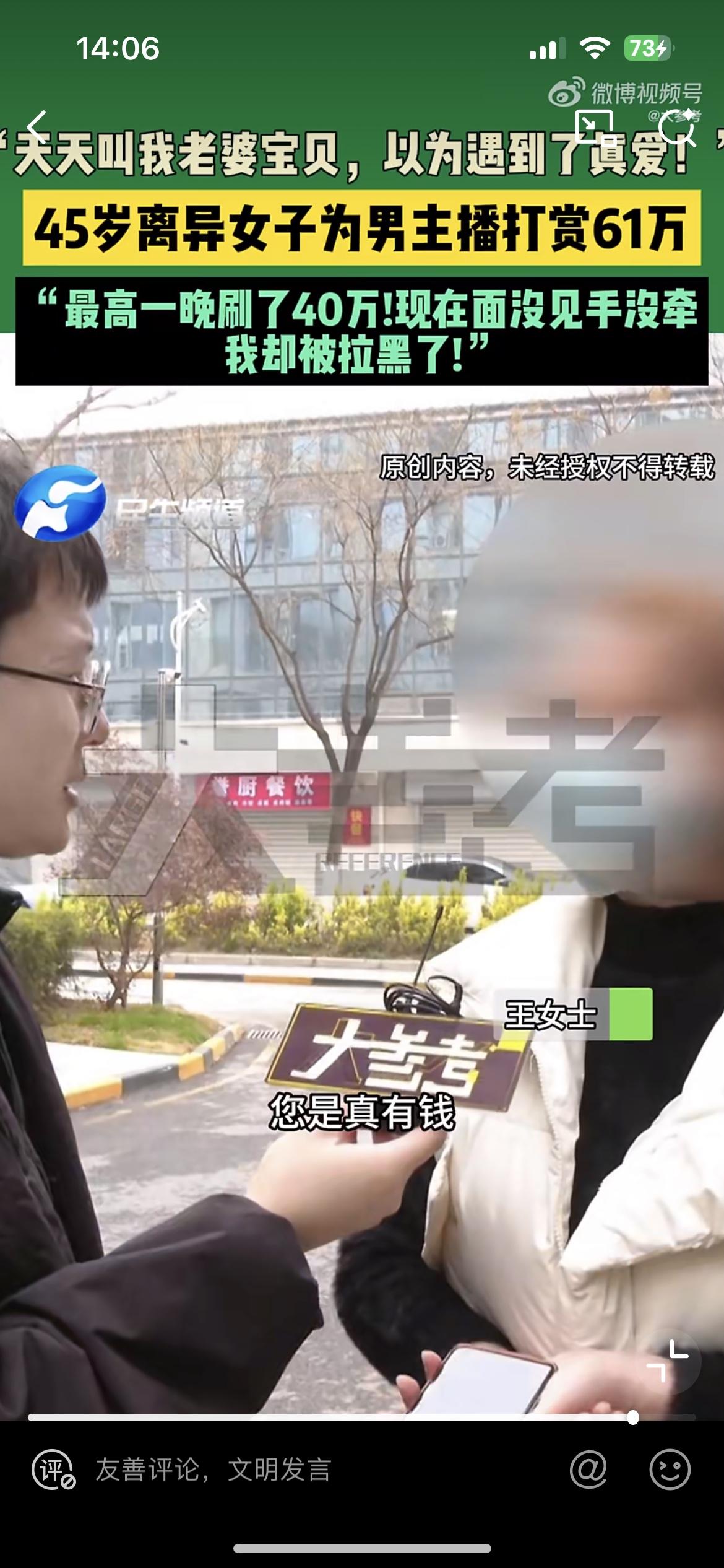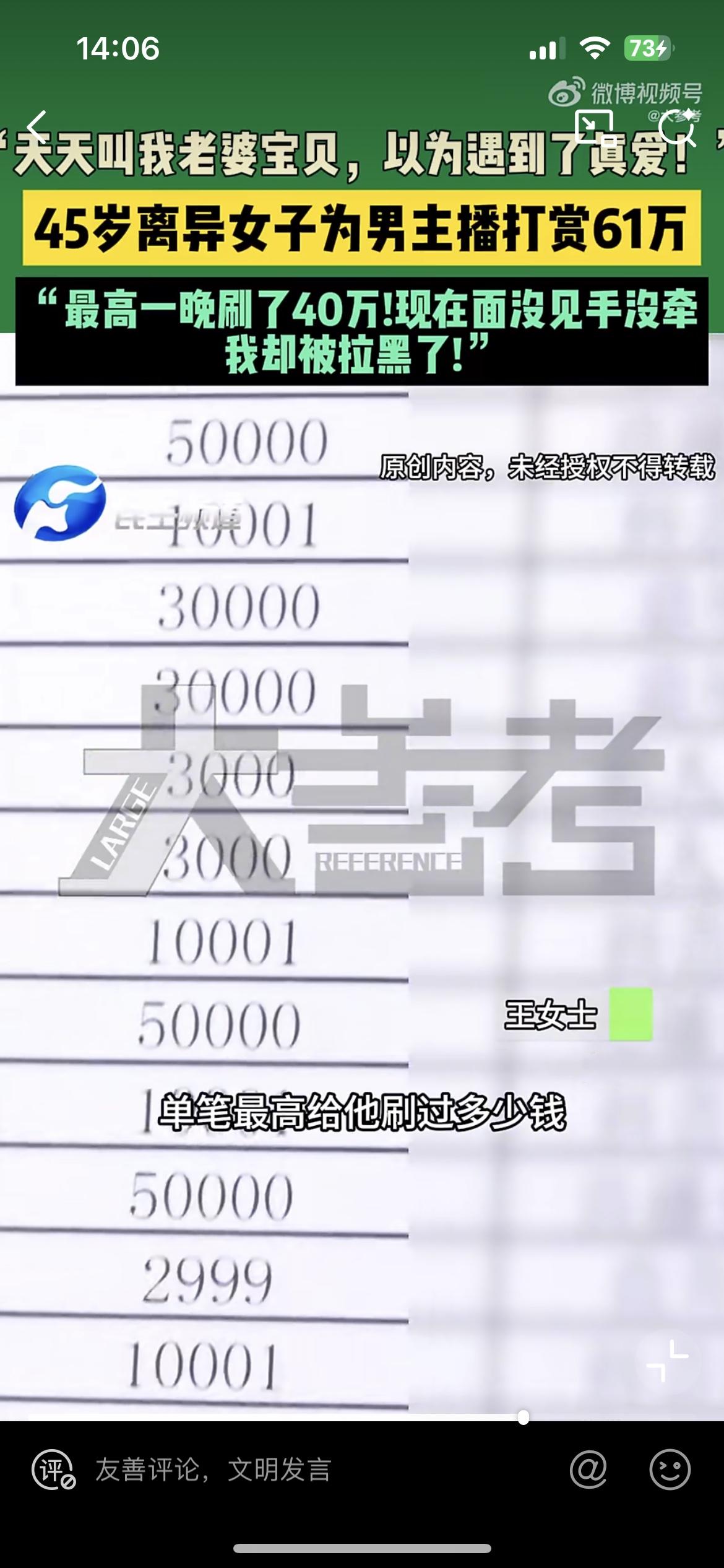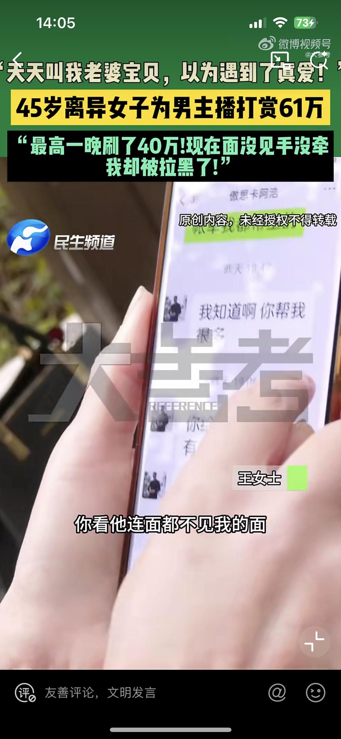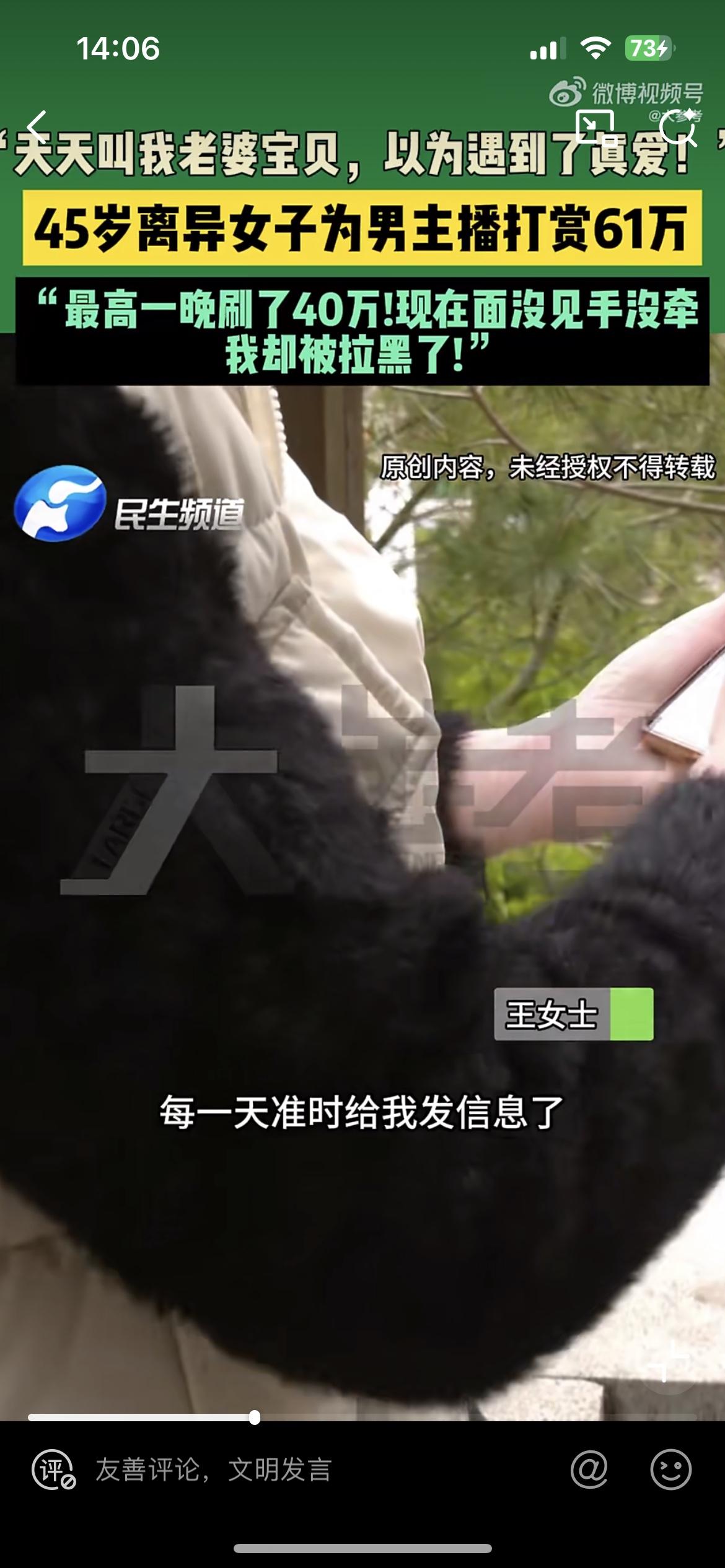 四川离异 45 岁小仙女迷上主播,一声老婆给人家打赏 61 万,连手都没牵到。这名女子早早就离婚了,孤枕难眠。喜欢看各种主播,并深深的迷上了其中一个男主播。女子为了博主播一笑,不惜一掷千金帮他打 pk ,送游艇嘉年华。主播于是加了女子的微信,二人聊得火热。一声声老婆宝贝的叫着,让女子以为找到了真爱,每天嘘寒问暖,甚至晚上还关心盖好被子,让女人觉得主播是真的关心她,爱她。女子前前后后为这名主播花了 61 万,心想应该可以和主播见见面,谈谈心,没想到人家直接把她拉黑了。因为女子的钱花光,再也无能为力。
