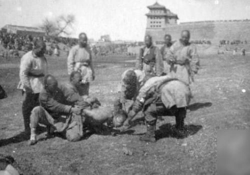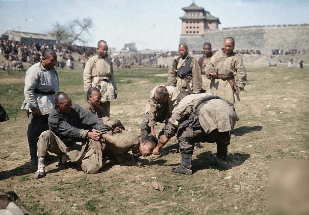 八国联军侵华期间,北京城墙下,中国平民惨遭施暴处决的血腥现场,是列强侵华罪行的又一铁证。 一群身着中式短打、腰束武装带的男子,多为协助八国联军的地方团练,正将一名赤裸上身的中国平民按倒在地,准备行刑,受害者往往被随意扣上“义和团拳民”的帽子,实则多为无辜百姓。