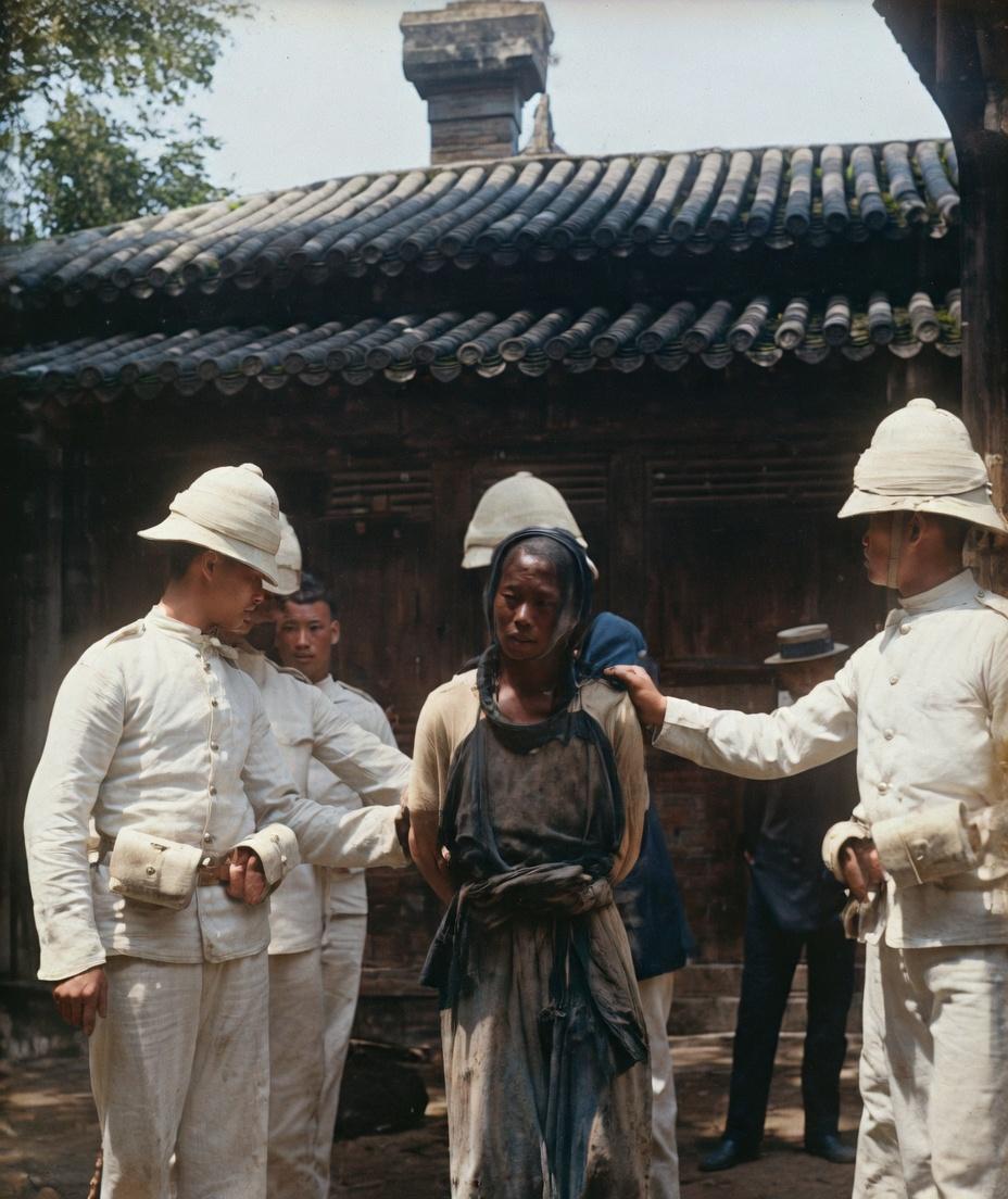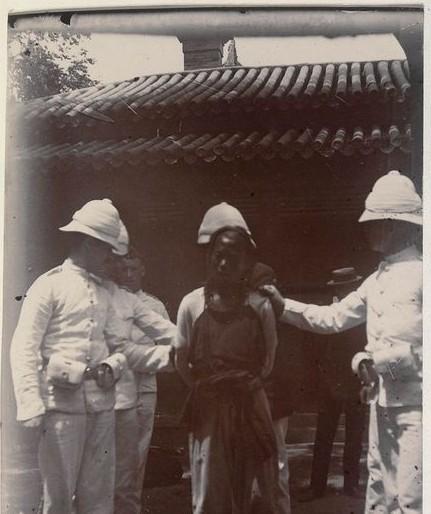 八国联军侵华期间,一名义和团成员被英军士兵抓捕的瞬间,他衣衫褴褛、头发凌乱,双手被反缚在身后,神情麻木而无奈。 左右两侧的士兵身着白色军装、头戴遮阳盔,这是英国殖民军的典型装束,他们正牢牢控制着拳民,姿态傲慢,彰显着侵略者的强权。 1900年,义和团运动在华北兴起,以“扶清灭洋”为口号,反抗西方列强的侵略与压迫。但在八国联军的武力镇压下,义和团运动最终失败,大量拳民被抓捕、屠杀。