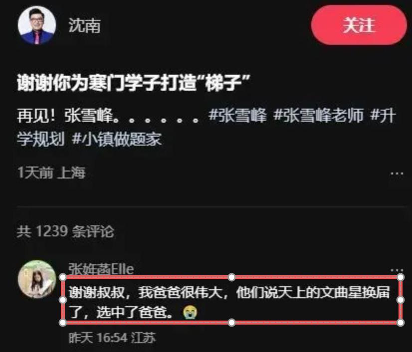 看到这一幕,真的让人泪目! 图二,是张雪峰女儿张姩菡,回复主持人沈南的话,一个10岁的孩子,能够在深处巨大的悲痛中,说出如此宽慰人心的话,太棒了! 张雪峰可能是近段时间去世的名人里,最让大众感到惋惜和难过的名人了。 除了他的赤子之心,实在是太年轻了。