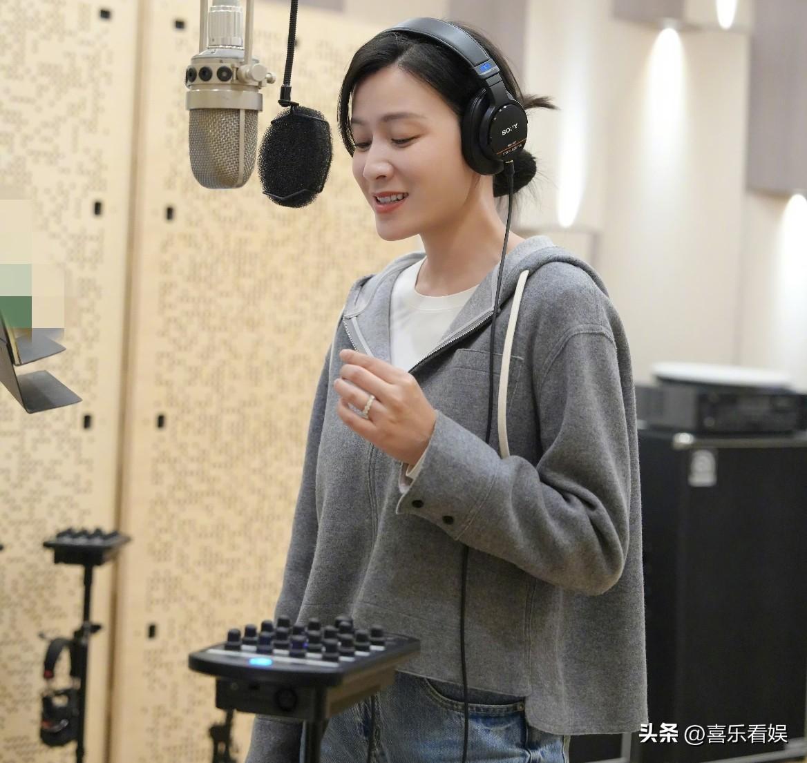 第二张是现在的她,戴着黑耳机站在录音棚里,灰外套配白内搭,低头看着歌词,眼神里多了从容。