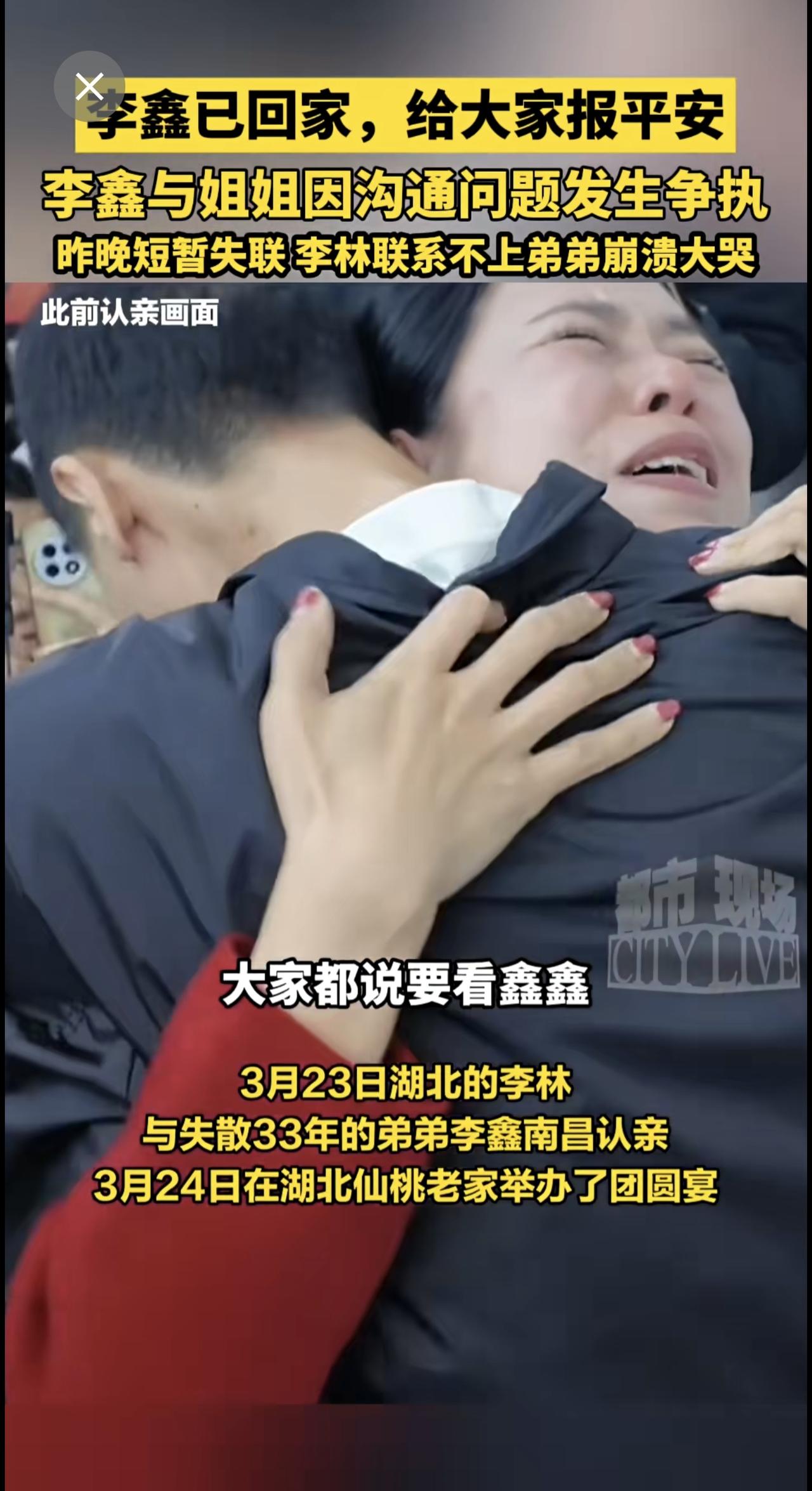 李鑫已回家 ,给大家报平安!李鑫与姐姐因沟通问题发生争执 ,昨晚短暂失联,李林联