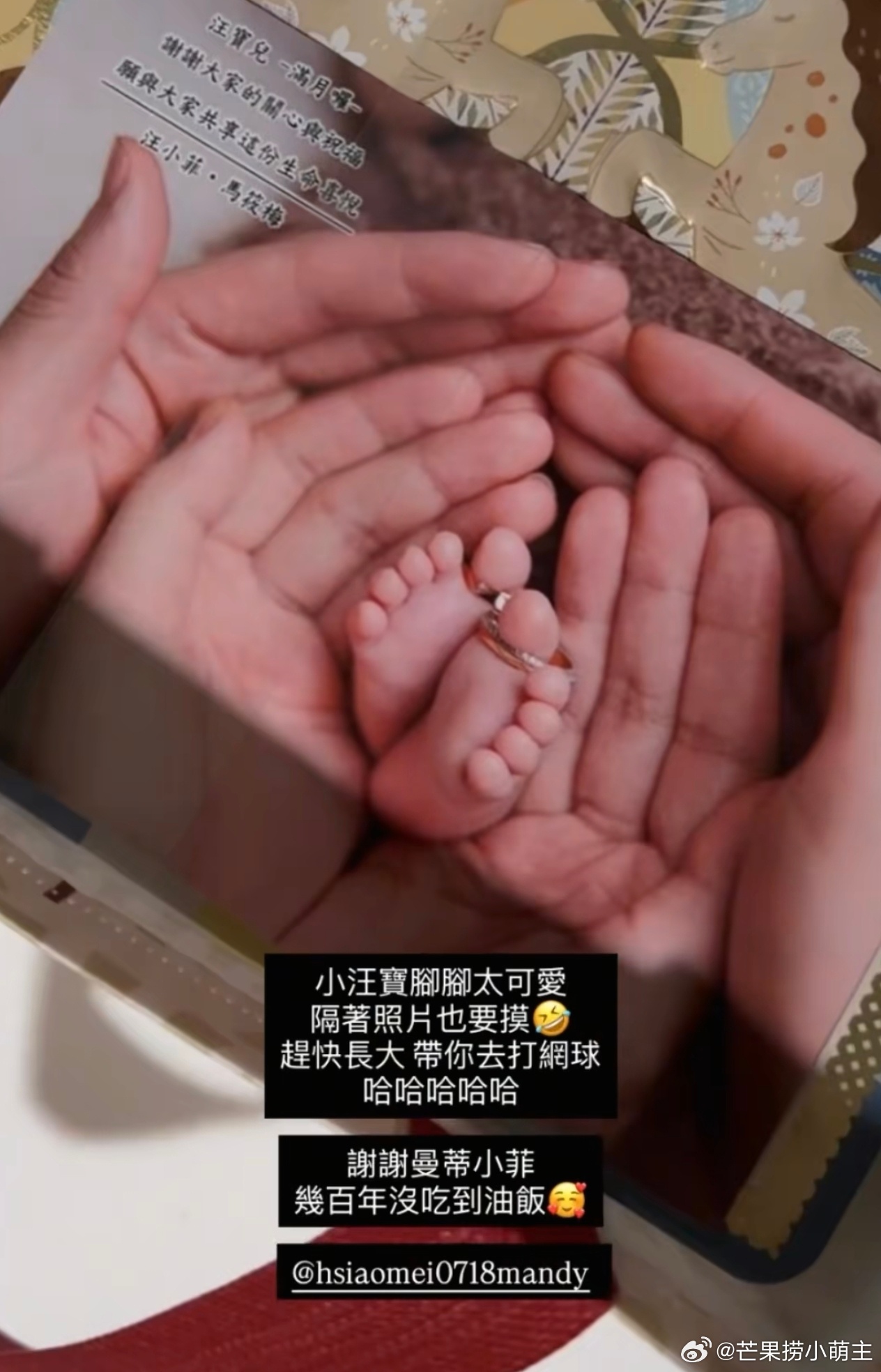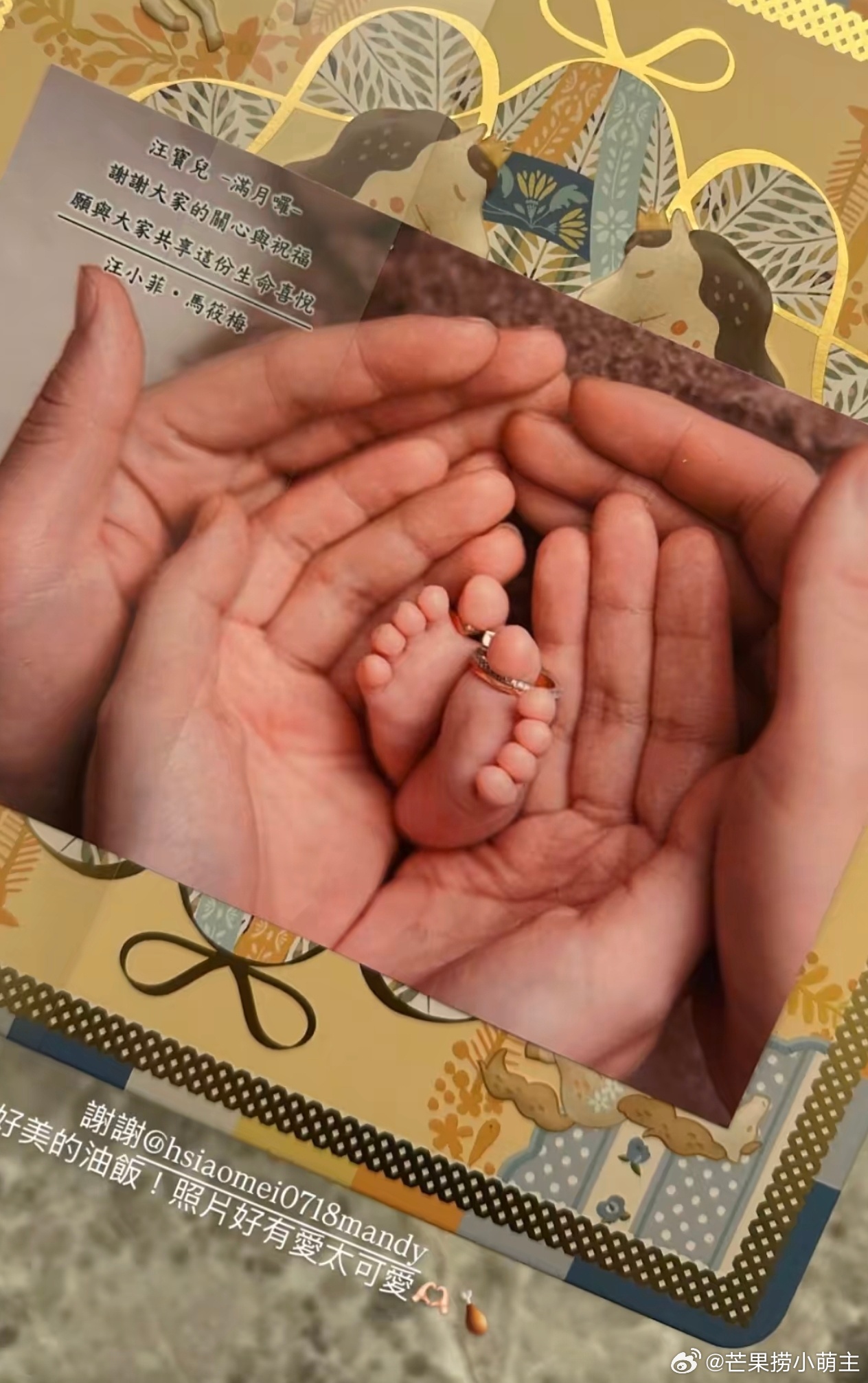 马筱梅儿子满月礼马筱梅一家三口手脚照 亲友晒出马筱梅准备的儿子满月礼,礼盒里放了油饭鸡腿饼干,还有一张一家三口的手脚照,看起来很用心。