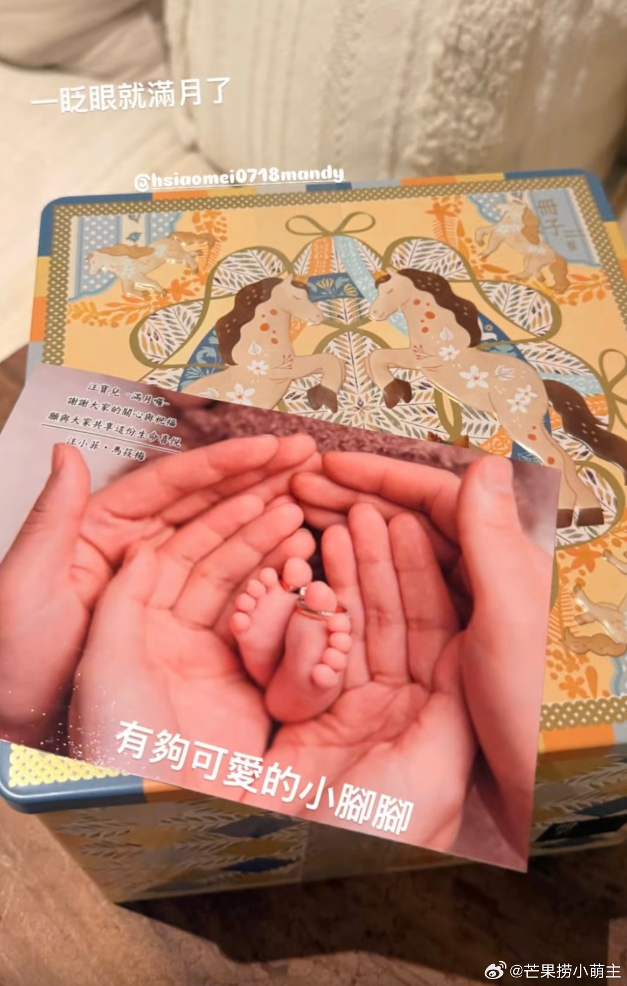 马筱梅儿子满月礼马筱梅一家三口手脚照 亲友晒出马筱梅准备的儿子满月礼,礼盒里放了